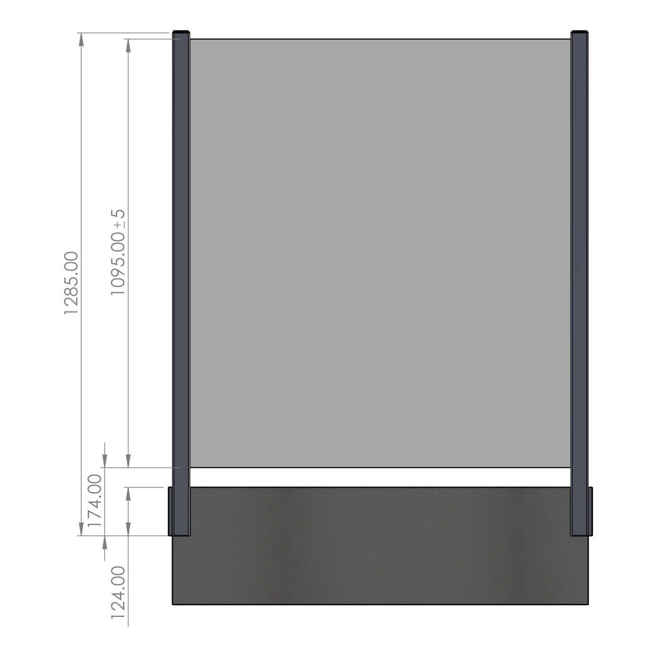 Sidemonteringen tillader glasfyldningen at løbe tæt på loftskantens linje uden at gribe ind i balkonpladens overflade. Måltegningen bekræfter, at den samlede byggehøjde er 1285 mm, hvoraf 1095 mm falder på glaspanelet og 174 mm er frihøjden mellem glassets nedre kant og monteringsbasens øvre kant. Denne målopsætning sikrer den normkrævede gelænderhøjde, mens der samtidig bevares æstetiske proportioner mellem elementerne.