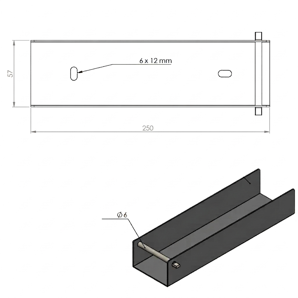 C-profilen har et C-formet profil, hvor betonsokkelpladen placeres. Den udvendige bredde af profilen er 57 mm, hvilket giver mulighed for fri og stabil placering af en 55 mm tyk plade med en lille monteringsklarance, der gør det lettere at installere. Den indbyggede tværgående stang Ø 6 mm fungerer som spærre — forhindrer, at sokkelen glider ud af beslaget, hvilket øger holdbarheden og sikkerheden af hele hegnskonstruktionen.