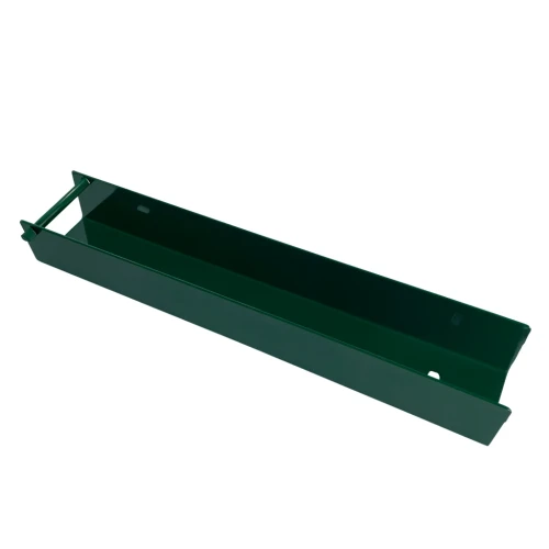 Produktet er fremstillet af galvaniseret stål beklædt med pulverlak i farven grøn RAL 6005. Dobbelt korrosionsbeskyttelse — galvaniseringslag plus pulverlakering — garanterer mange års modstandsdygtighed mod fugt, nedbør og korrosion, hvilket eliminerer behovet for yderligere vedligeholdelse. Den æstetiske, ensartede finish harmonerer smukt med moderne panelhegn i den populære grønne farveskala.