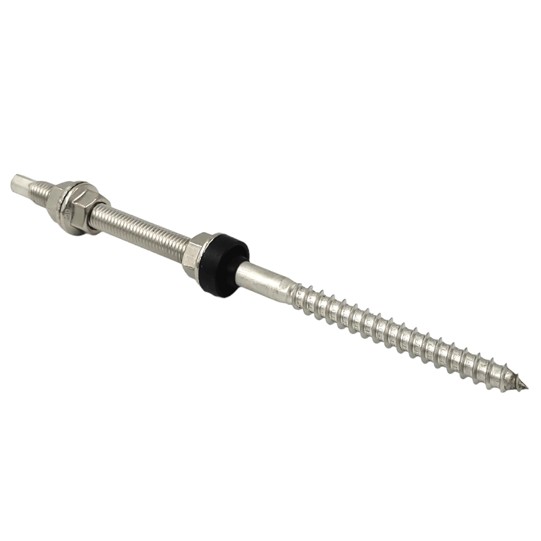 M12x250mm Dobbeltgevindskrue, en af de mange komponenter, der er nødvendige for installation af solcelleudstyr. Produktet installeres på tagdækning, metalplader, helvedesild eller filt. Elementet er kendetegnet ved to forskellige tråde i hver ende. Den gevindskårne ende skrues direkte på trætagkonstruktionen. Den anden ende bruges til at fastgøre adaptere med flangemøtrikker.
