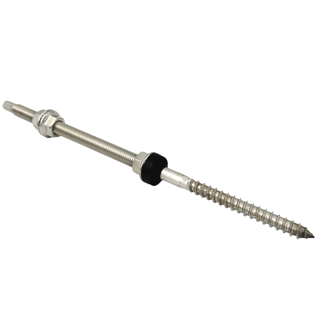 M12x300mm Dobbeltgevindskrue, en af de mange komponenter, der er nødvendige for installation af solcelleudstyr. Produktet installeres på tagdækning, metalplader, helvedesild eller filt. Elementet er kendetegnet ved to forskellige tråde i hver ende. Den gevindskårne ende skrues direkte på trætagkonstruktionen. Den anden ende bruges til at fastgøre adaptere med flangemøtrikker.