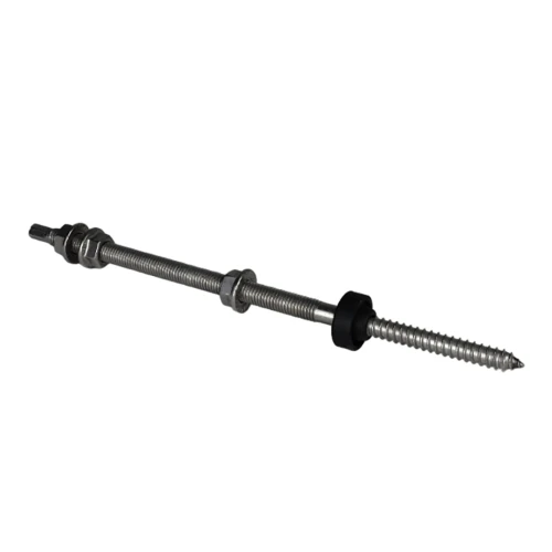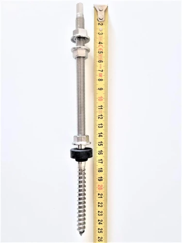 Dobbeltgevindskrue, en af de mange nødvendige komponenter til montering af solcelleudstyr. Produktet monteres på tagdækninger, plader, tagshingel eller tagpap. Elementet er kendetegnet ved to forskellige gevind i hver ende. Den gevindede ende skrues direkte ind i tagets trækonstruktion. Den anden ende bruges til fastgørelse af adaptere med flangemøtrikker.