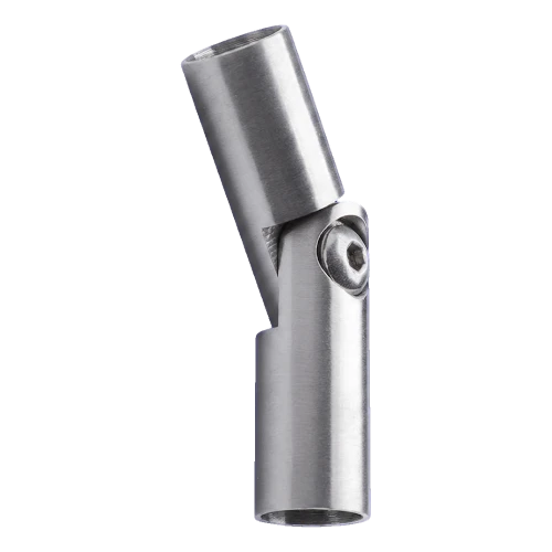 Samlingen er fremstillet af højkvalitets rustfrit stål AISI 304 med satineret finish, hvilket sikrer høj korrosionsbestandighed og ensartet udseende med andre elementer af børstede stålgeländre. Vinklen justeres ved hjælp af indbusskrue, hvilket giver hurtig og sikker montering uden specialværktøj.