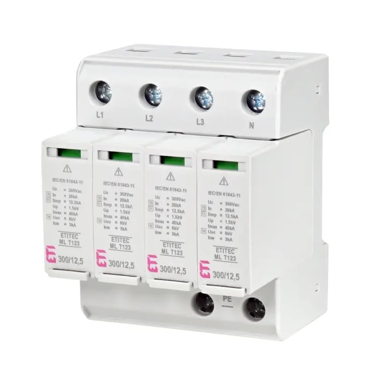 Surge Arrester Type 1+2+3 (B+C+D) 4P 20kA 1.5kV ETITEC ML T123 300/125 4+0 002440667 ETI er en avanceret beskyttelsesanordning, som bruges til at beskytte elektriske installationer mod overspænding.