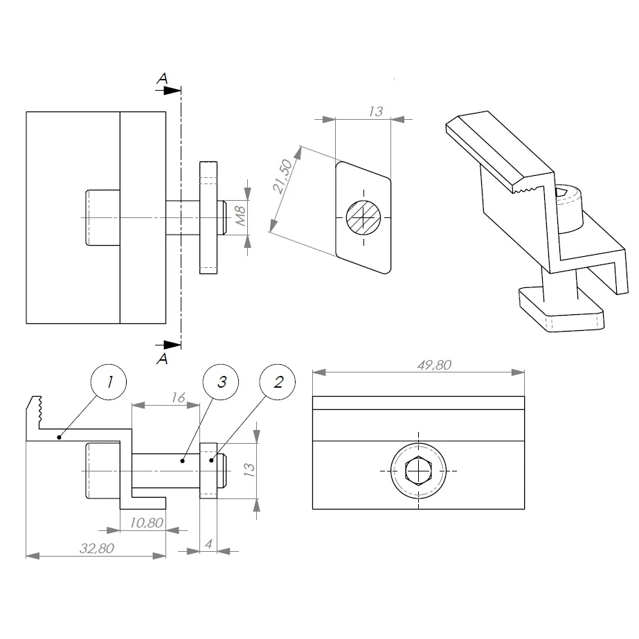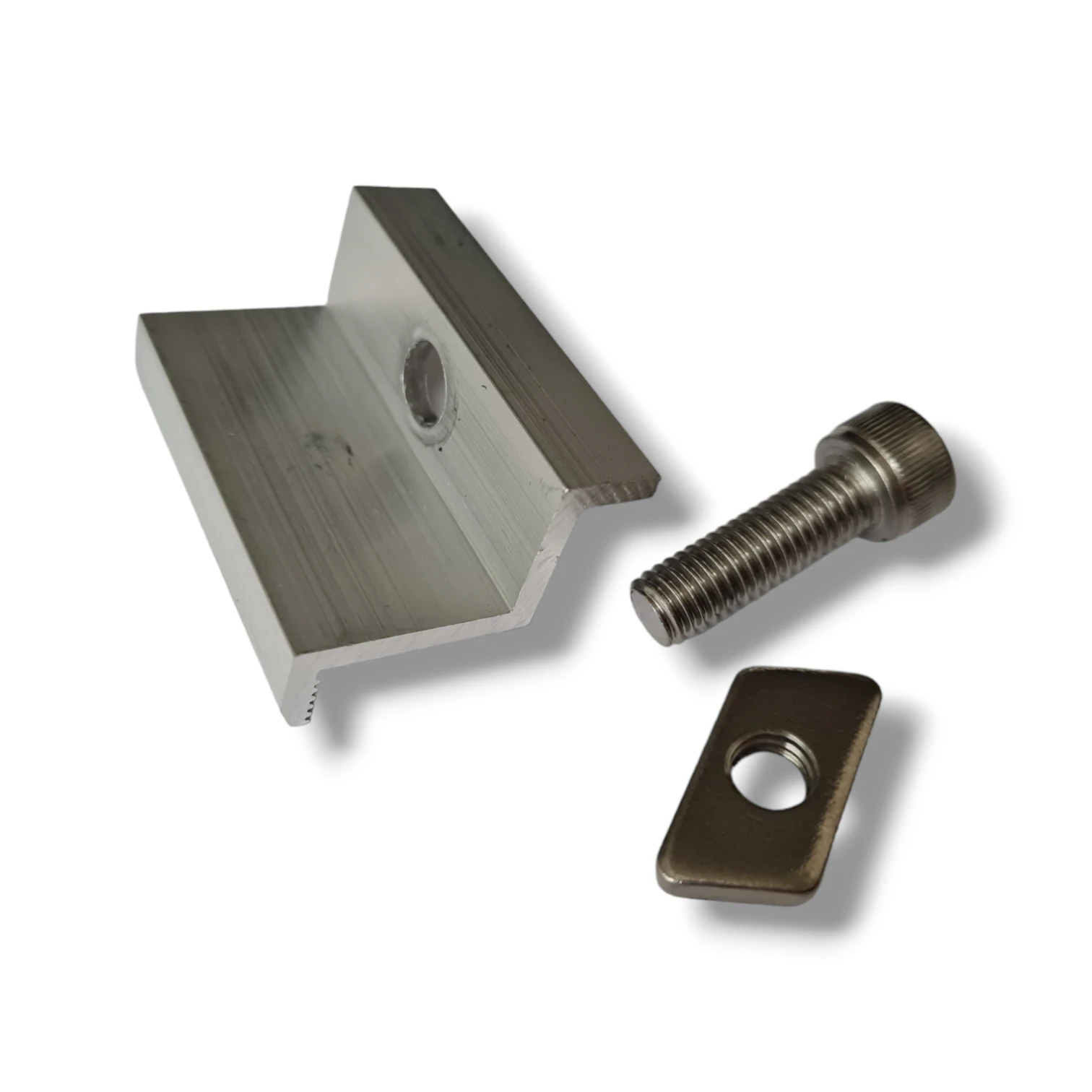 30 mm sideklemme med skrue og indsats fremstillet af aluminium 6060, til montering af 30 mm solcellemoduler med DIN 912 M8x20-skruer.