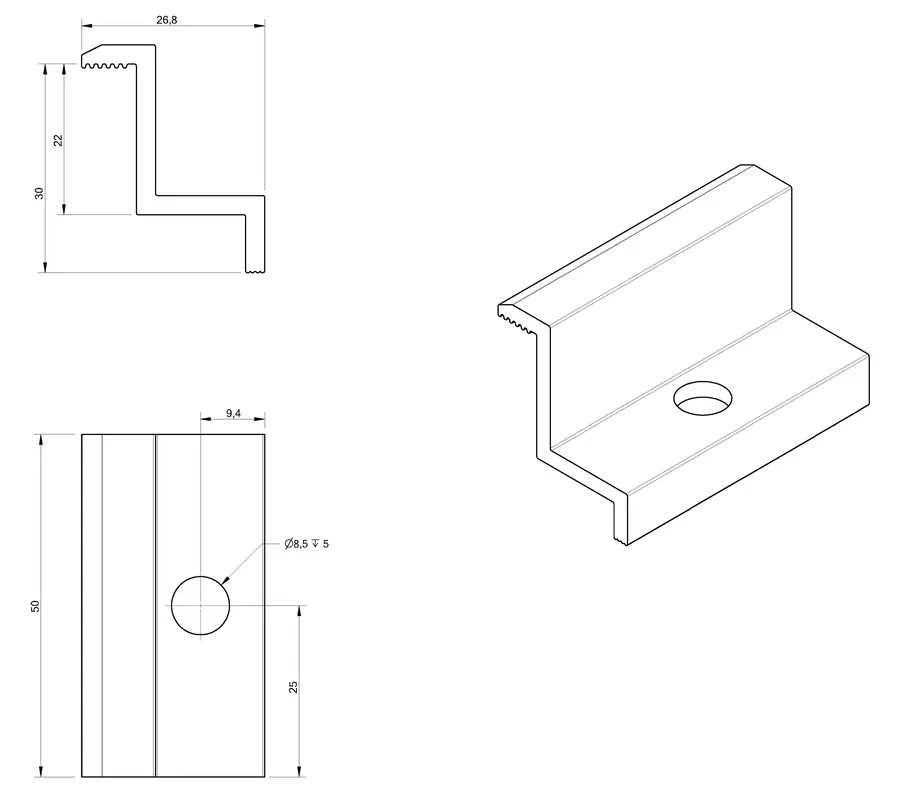 Trykklemme i aluminium 6060 anodiseret, 30 mm, M8-hul, til fastgørelse af solcellemoduler.
