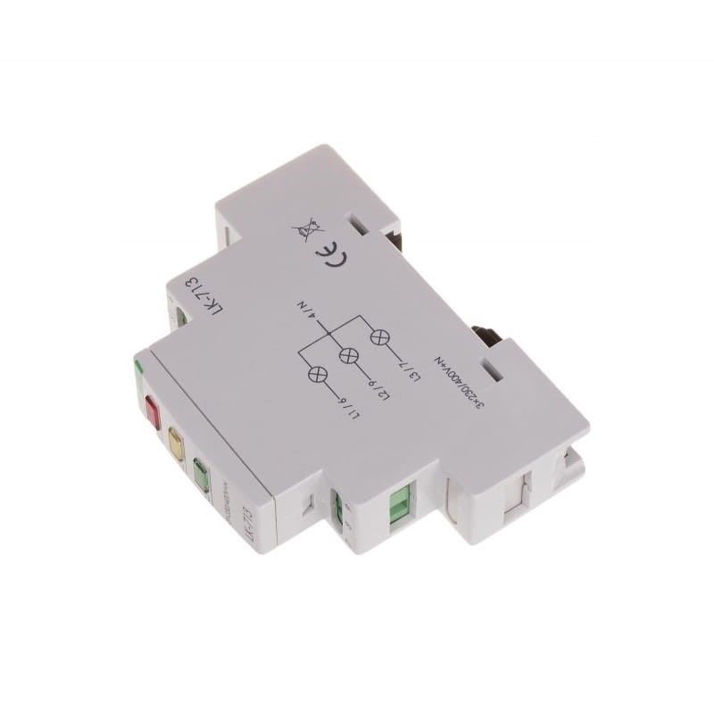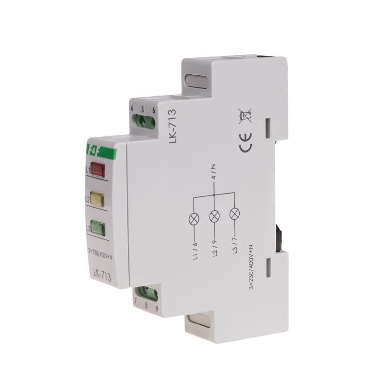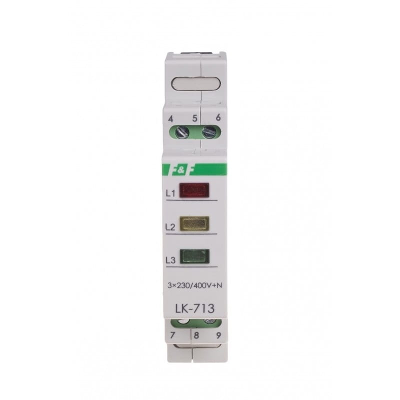 Den 3×230V+N 3xLED grønne indikatorlampe LK-713 G fra F&F FILIPOWSKI er designet til optisk at signalere tilstedeværelsen af spænding i hver af de tre faser i et trefaset netværk. Når der er spænding i en given fase, lyser den tilsvarende grønne LED. Hele enheden drives af 3×230 V+N og indeholder tre grønne LED'er.