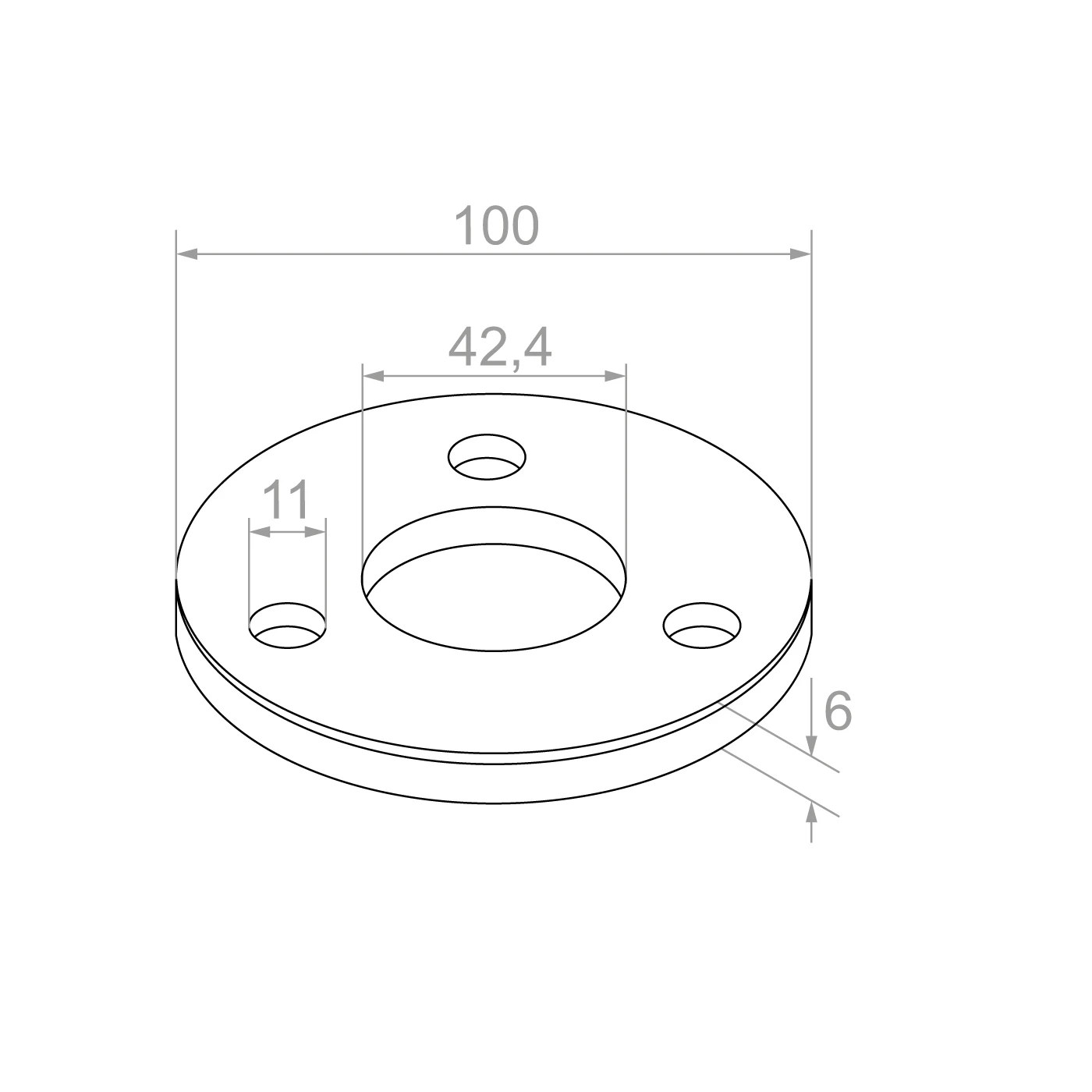 Bundpladen har tre monteringshuller med diameter 11 mm fordelt jævnt på omkredsen, hvilket muliggør sikker og symmetrisk fastgørelse. Det centrale hul med diameter 42,4 mm er tilpasset til stolperør i 42,4 mm systemet — stolpen svejses direkte ind i hullet, hvilket giver en holdbar og stiv forbindelse.
