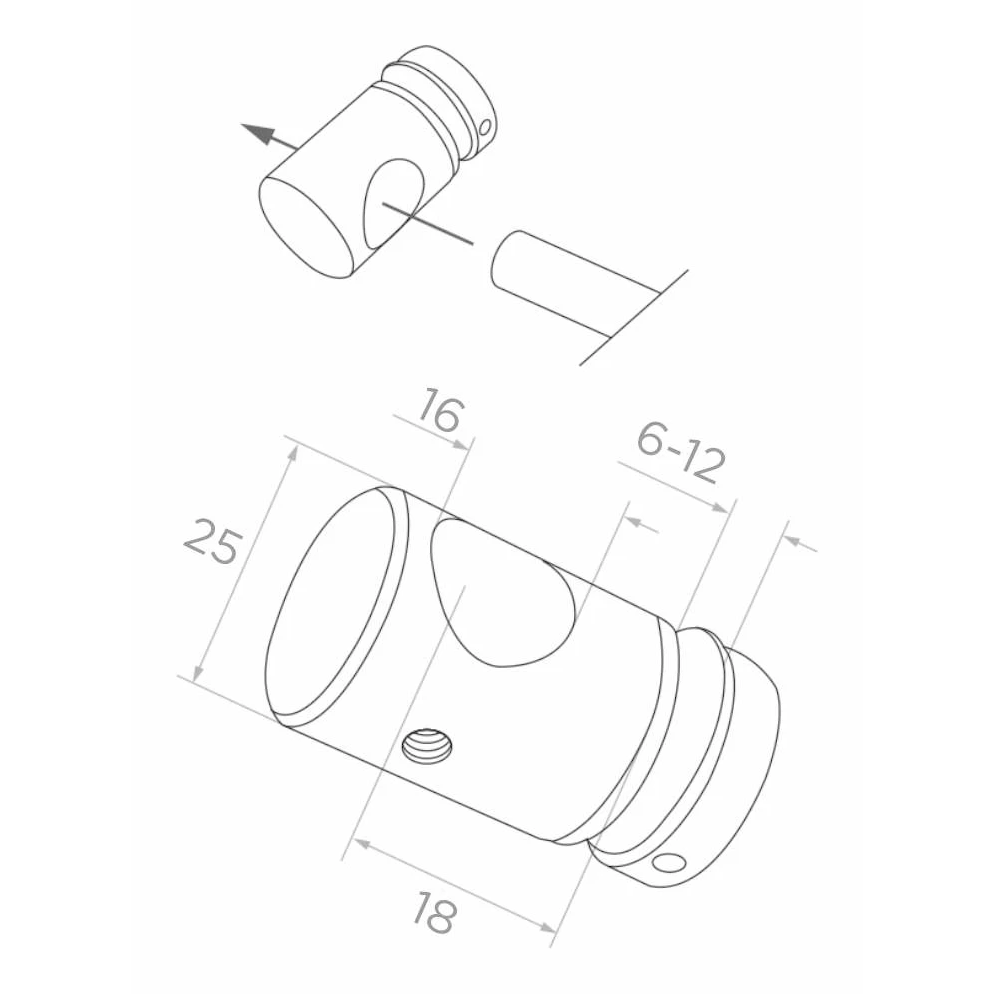 Gennemgående og punktholder ø 16mm ø 25/30/M6x15 glas 6-11,52mm AISI304 satin