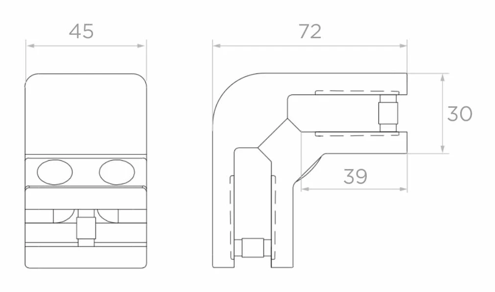 Glasbeslag 6-12,76 mm 90° firkantet 72x45x30 mm pin AISI 304 satin