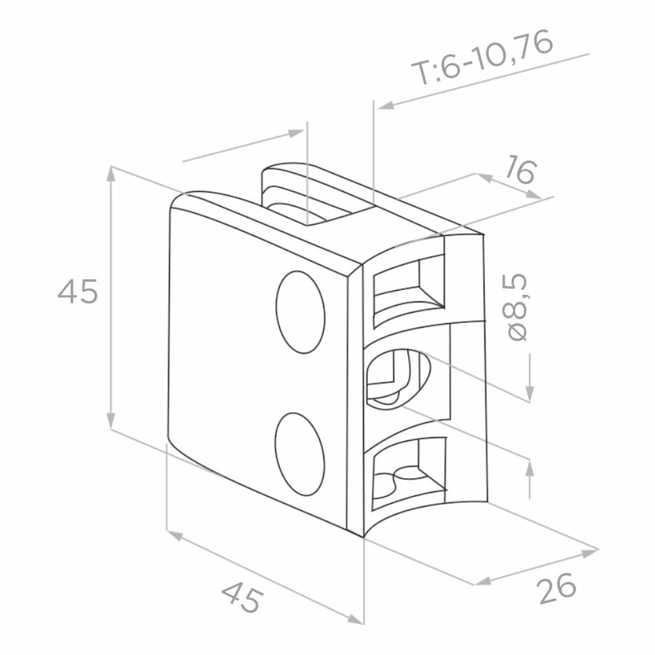 Holderen er velegnet til projekter, hvor der kraves hurtig og ensartet fastgorelse af glaspaneler pa rorformede stolper. Den kompakte konstruktion 45×45 mm og skruebaseret montering giver mulighed for pracis justering af klemtrykket, hvilket er vigtigt ved lamineret glas med varierende tykkelse i omradet 6–10,76 mm. Den satinerede finish harmonerer med andre elementer i rakvark og systemer i rustfrit stal.