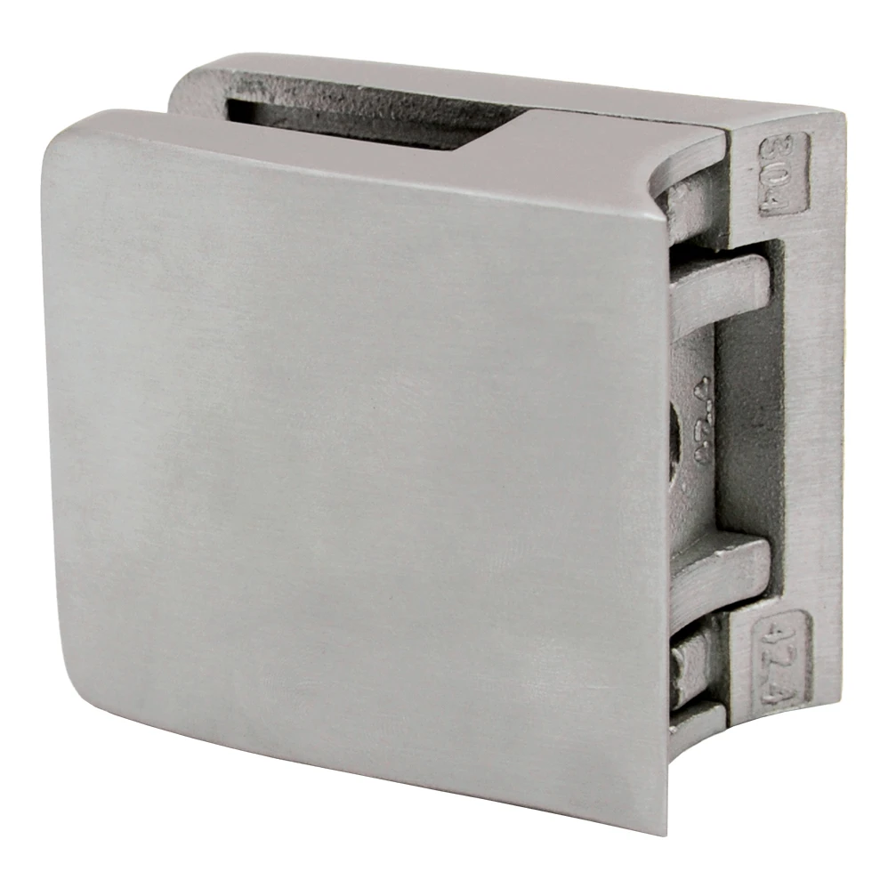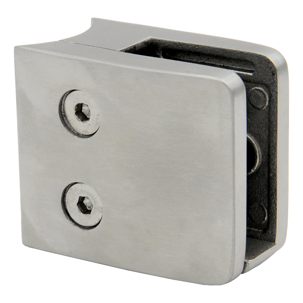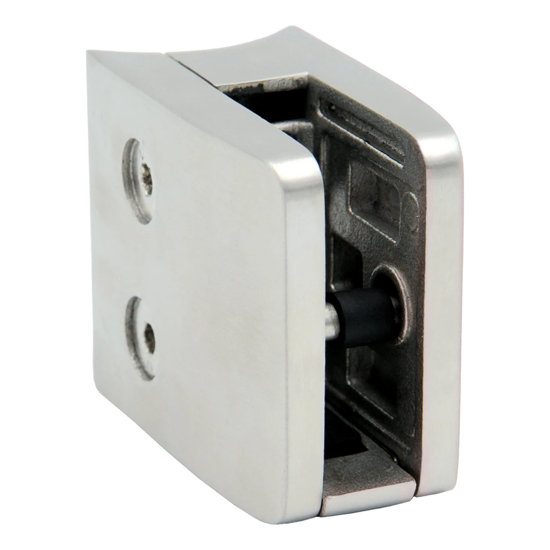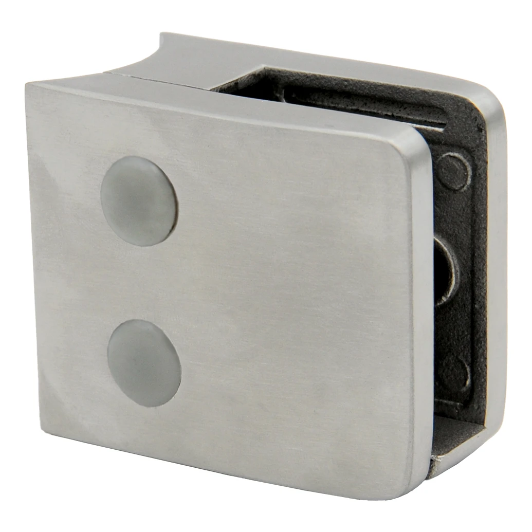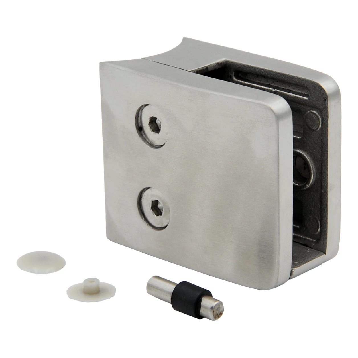 Rektangulær glasholder med beslag og sikringspin, beregnet til professionel montering af glaspaneler på rør med en diameter på 42,4 mm. Fremstillet af rustfrit stål AISI 304 med satineret overflade — giver et æstetisk, moderne udseende samt høj korrosionsbestandighed, hvilket gør den velegnet til både indendørs og udendørs brug.