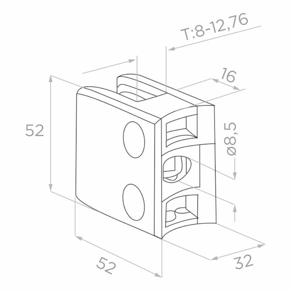 Glasholder 8-12,76 mm 52x52x32 mm beslag og pin AISI 304 system 42,4 mm satin