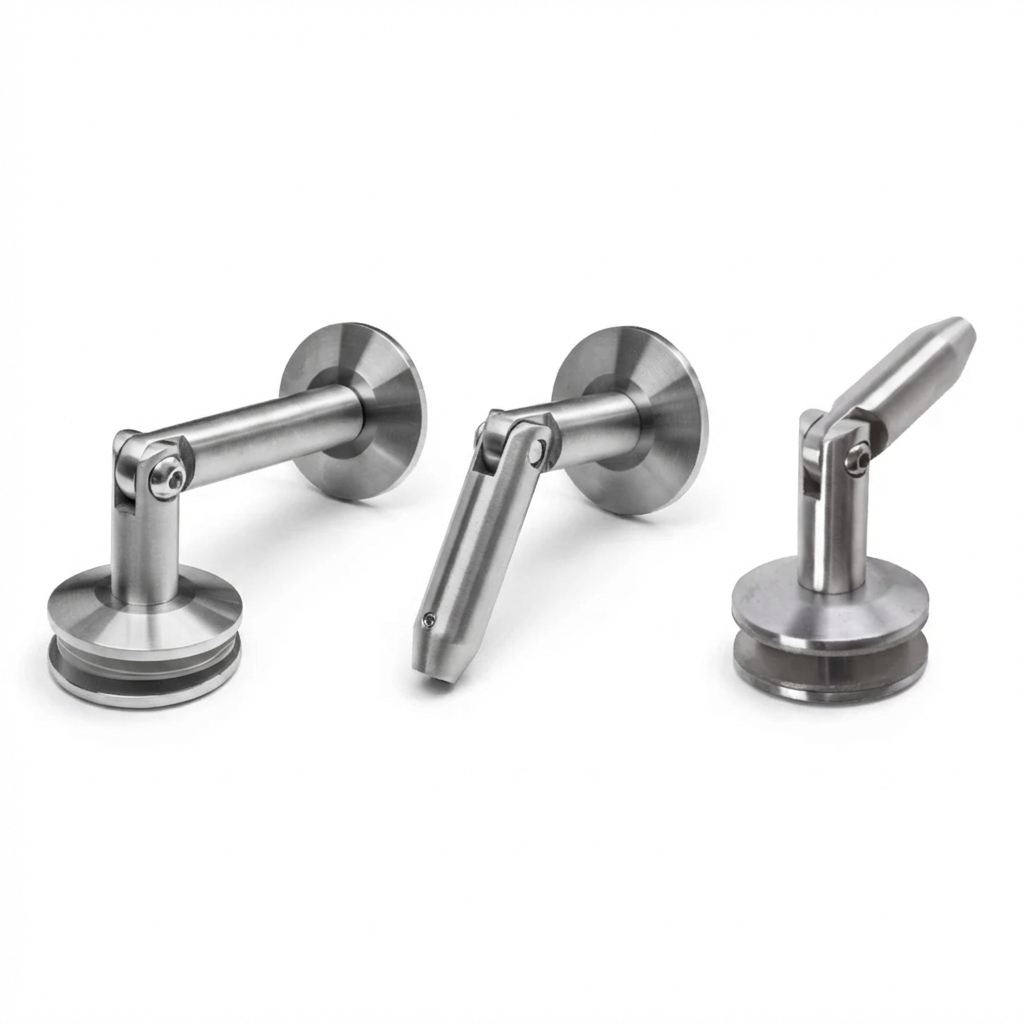 Systemet består af tre præcisionsfremstillede beslag i rustfrit stål AISI 304 med satineret finish, som sikrer holdbarhed og et æstetisk udtryk i mange år. Hvert element har et skjult monteringshul, hvilket giver hele konstruktionen et elegant og minimalistisk præg. Glasset kommer ikke i direkte kontakt med metallet – sættet indeholder trykgummier, som beskytter glaspanelet og samtidig stabiliserer det i den korrekte position.