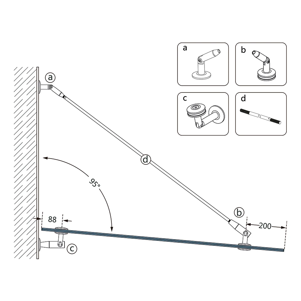 Staget fastgøres i bygningens facade ved hjælp af stag–væg-beslaget (element a) og strammes derefter til den optimale position for overdækningen. Væg–glas-beslaget (element c) holder glassets nedre kant i en afstand af 88 mm fra facaden, mens glas–stag-beslaget (element b) overfører belastningerne til stagstangen. Stagvinklen kan justeres op til 95°, hvilket giver mulighed for at tilpasse systemet til forskellige monteringsforhold.