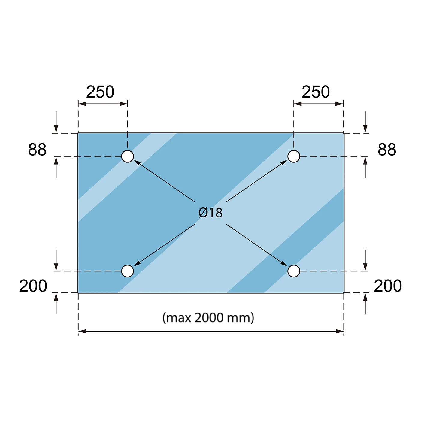- Øverste huller (væg–glas-beslag): 88 mm fra overkant, 250 mm fra sidekanter