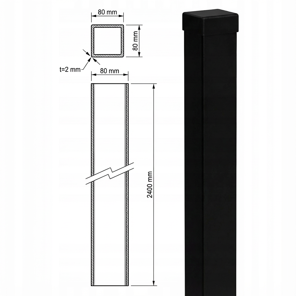Hegn stolpe 80x80 mm, længde 240 cm, vægtykkelse 2 mm – sort