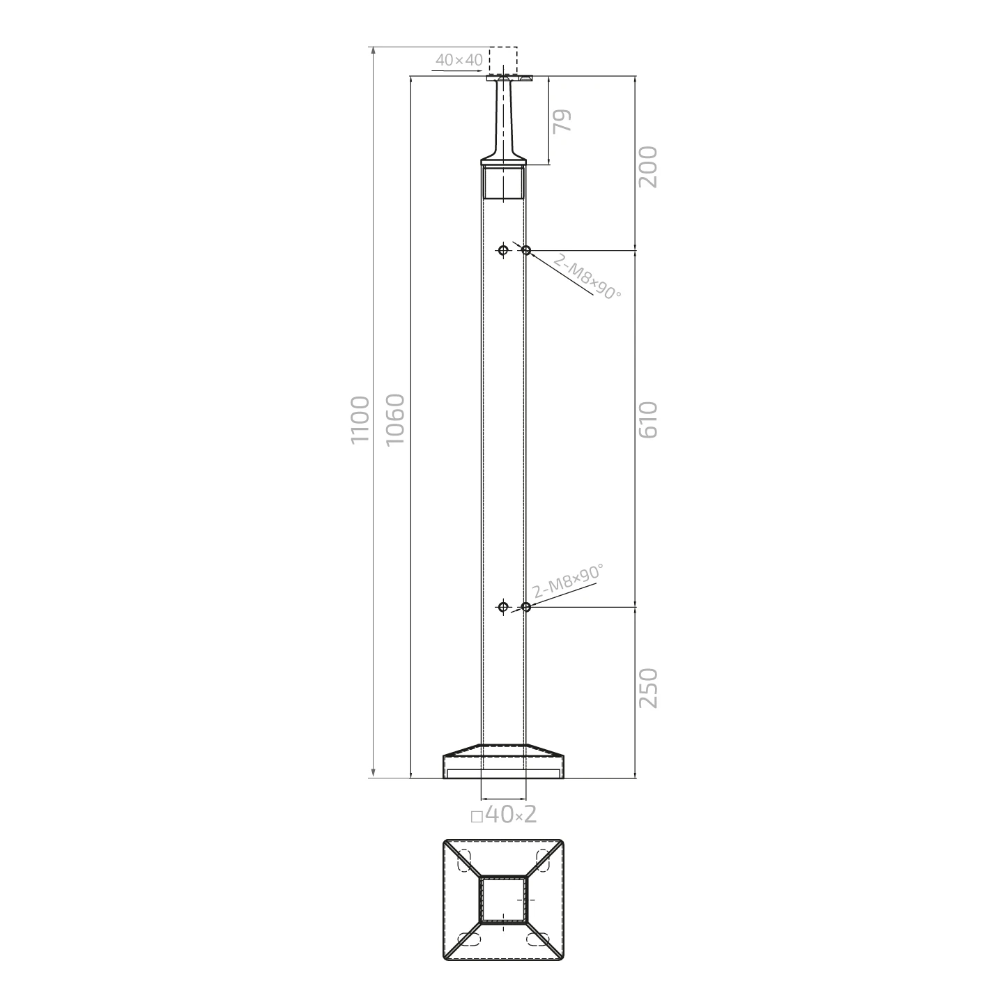 Stolpen er fremstillet af lukket profil med tværsnit 40×40 mm og vægtykkelse 2 mm, hvilket garanterer høj stivhed og holdbarhed af hele konstruktionen. Ved anvendelse af rustfrit stål AISI 304 viser produktet meget god korrosionsbestandighed og modstandsdygtighed over for vejrforhold, hvilket gør montering mulig både indendørs og udendørs – på altaner, terrasser eller trappeopgange.