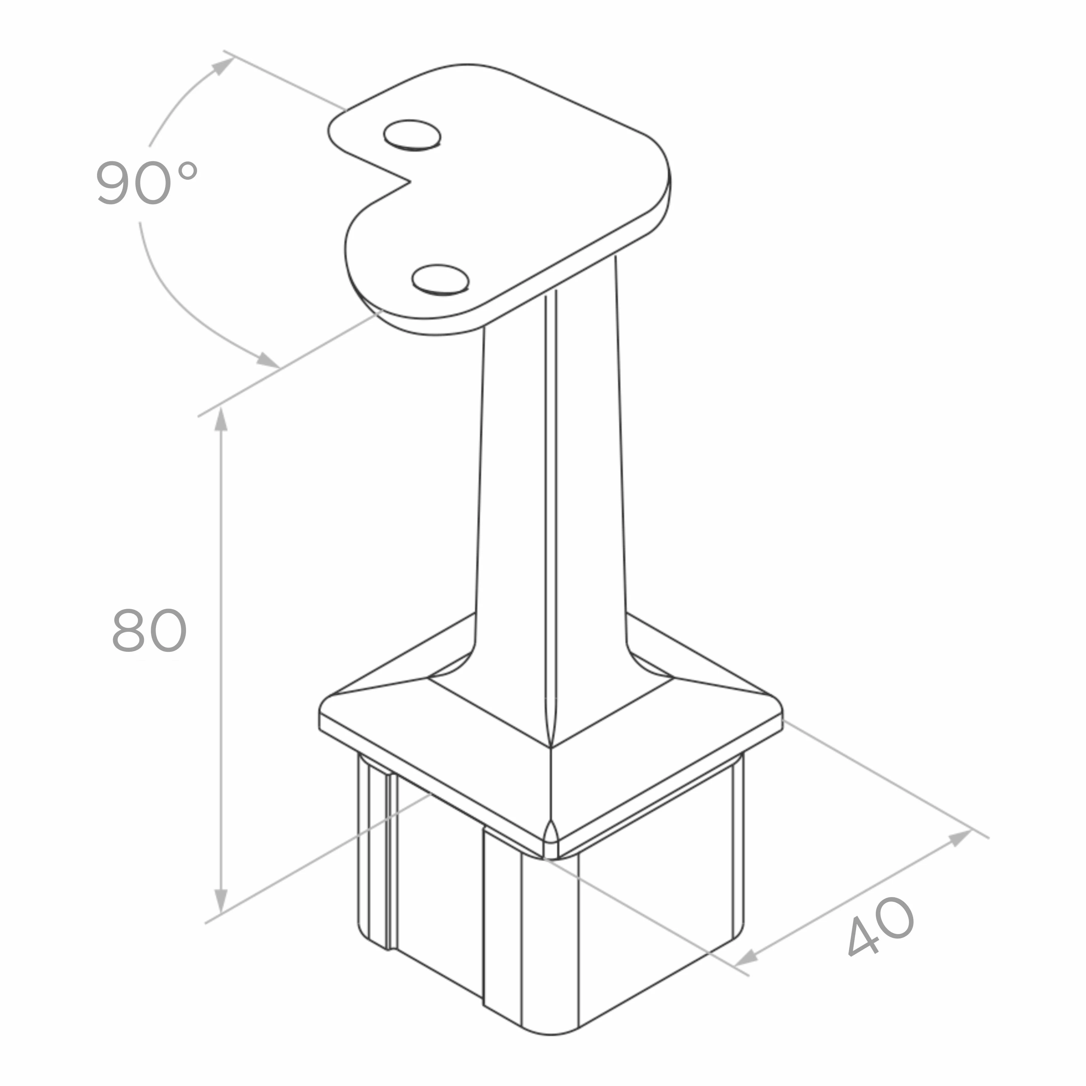 Håndlædsstøtten er ikke permanent fastklæbet – dens montering kræver brug af anaerob lim til rustfrit stål. Denne løsning giver installatøren fuld frihed til at tilpasse stolpens placering til forholdene på byggepladsen. Hvis det er nødvendigt – f.eks. på grund af ujævn gulv – kan stolpens profil skæres til den krævede længde. Hjørnekoblingen til håndlædet har en højde på 80 mm, base 40 mm tilpasset stolpens profil, og monteringspladernes åbningsvinkel er 90°.