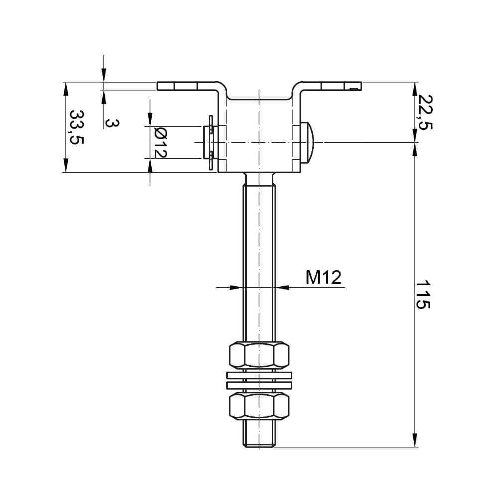 Justerbar hængsel M12 bøjet er et holdbart beslag-element beregnet til montering af fløjporte og låger. Stålkonstruktion med gevindtap M12 med arbejdslængde 115 mm sikrer præcis justering af fløjens position efter afsluttet montering — uden behov for demontering af hængslet. Den bøjede fod med to monteringshuller i bønneform gør det muligt at fastskrue sikkert og hurtigt til stolpe eller ramme.