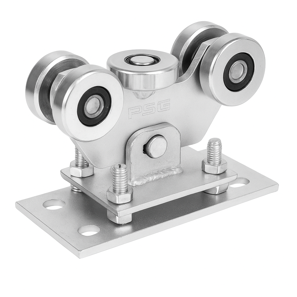 Løbesæt med 5 metalruller er hjørnestenen i pakken. Konstruktionen er svingbar — løbesættet er forbundet med soklen via en tap, hvilket giver det mulighed for automatisk at tilpasse sig skydeporthskinnen. Fire lodrette ruller styrer skinnen fra siderne, mens én vandret rulle optager den lodrette belastning. Justerbar højde via monteringsskruer sikrer præcis indstilling af porten. Galvaniseret finish garanterer korrosionsbestandighed og lang levetid ved udendørs brug.