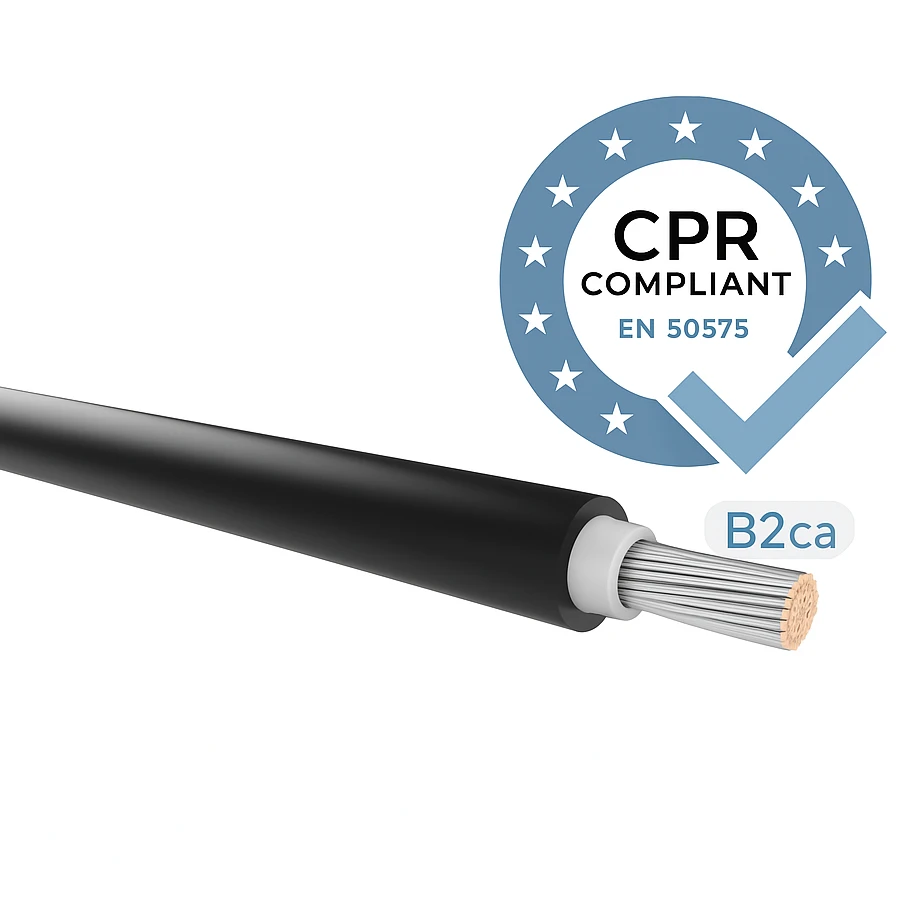 Solarkabel H1Z2Z2-K 6 mm2 sort er et enkeltledet PV-kabel beregnet til forbindelser i solcelleanlæg – både mellem solpaneler og på strækningen paneler–inverter. Takket være den højeste brandklasse B2ca-s1,d0,a1 i overensstemmelse med CPR-forordningen opfylder kablet de mest stringente krav til brandsikkerhed, hvilket gør det muligt at anvende det indendørs, på tage samt i store solcelleparker på jorden.