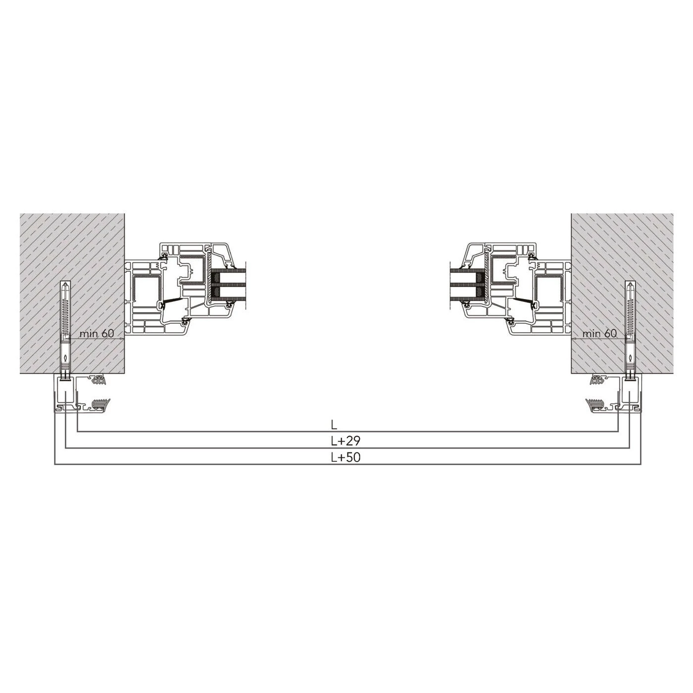 - L + 50 mm — samlet udvendig bredde af systemet (mellem udvendige kanter af profiler)