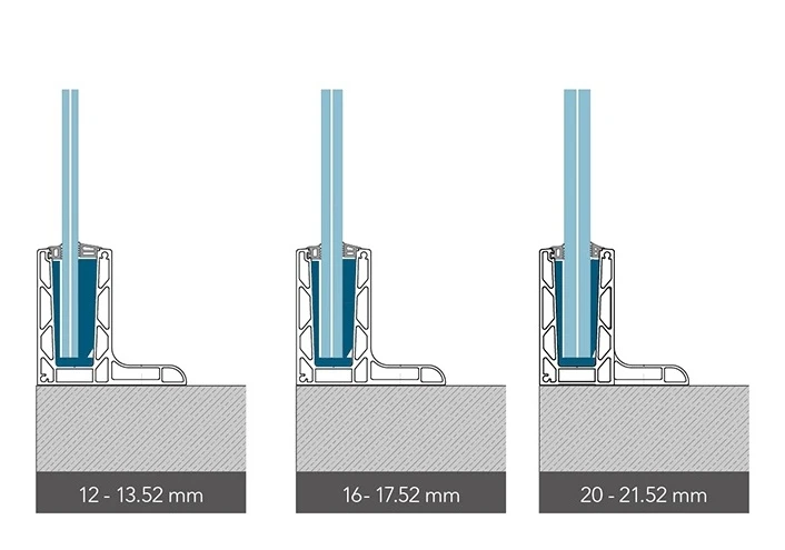 KE 105-profil fungerer med tre glastykkelse områder, hvilket muliggør tilpasning til forskellige statiske og projektkrav: