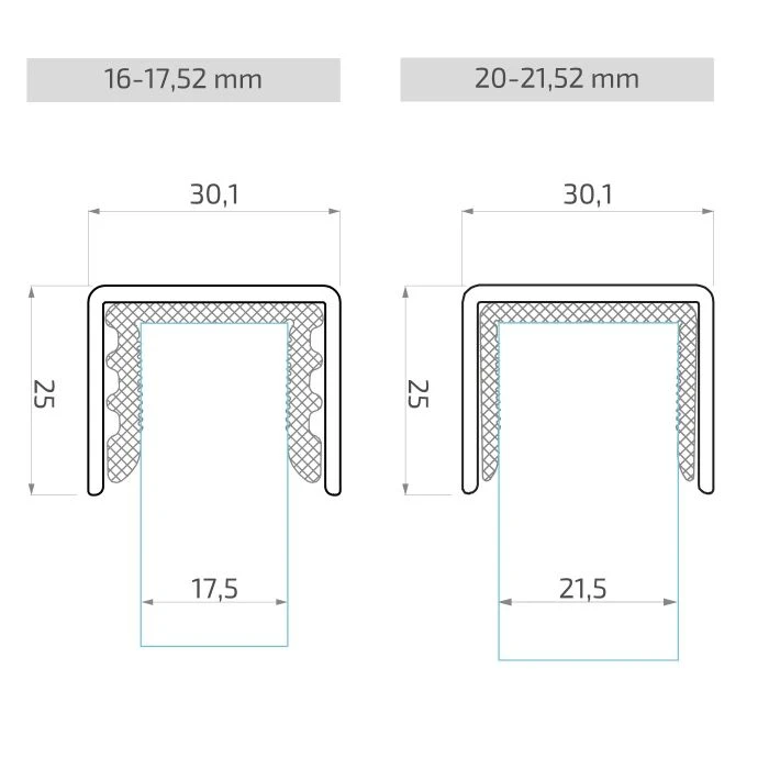 Profilen med rektangulært tværsnit 30,1 × 25 mm sikrer stabil fastsættelse på glaskanten og ergonomisk greb. Fabrikslængden på 5000 mm gør det muligt at skære til og tilpasse til dimensionerne af det konkrete projekt uden overdreven spild.