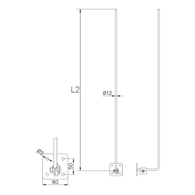 Monteringsholderen med en base på 80 mm muliggør stabil fastgørelse af lynspyddet på skorstenen. Monteringshuller med diameter Ø9 mm giver mulighed for anvendelse af standard ankerskruer. Holderens højde over basen er 50 mm, hvilket sikrer tilstrækkelig afstand fra skorstenens overflade.