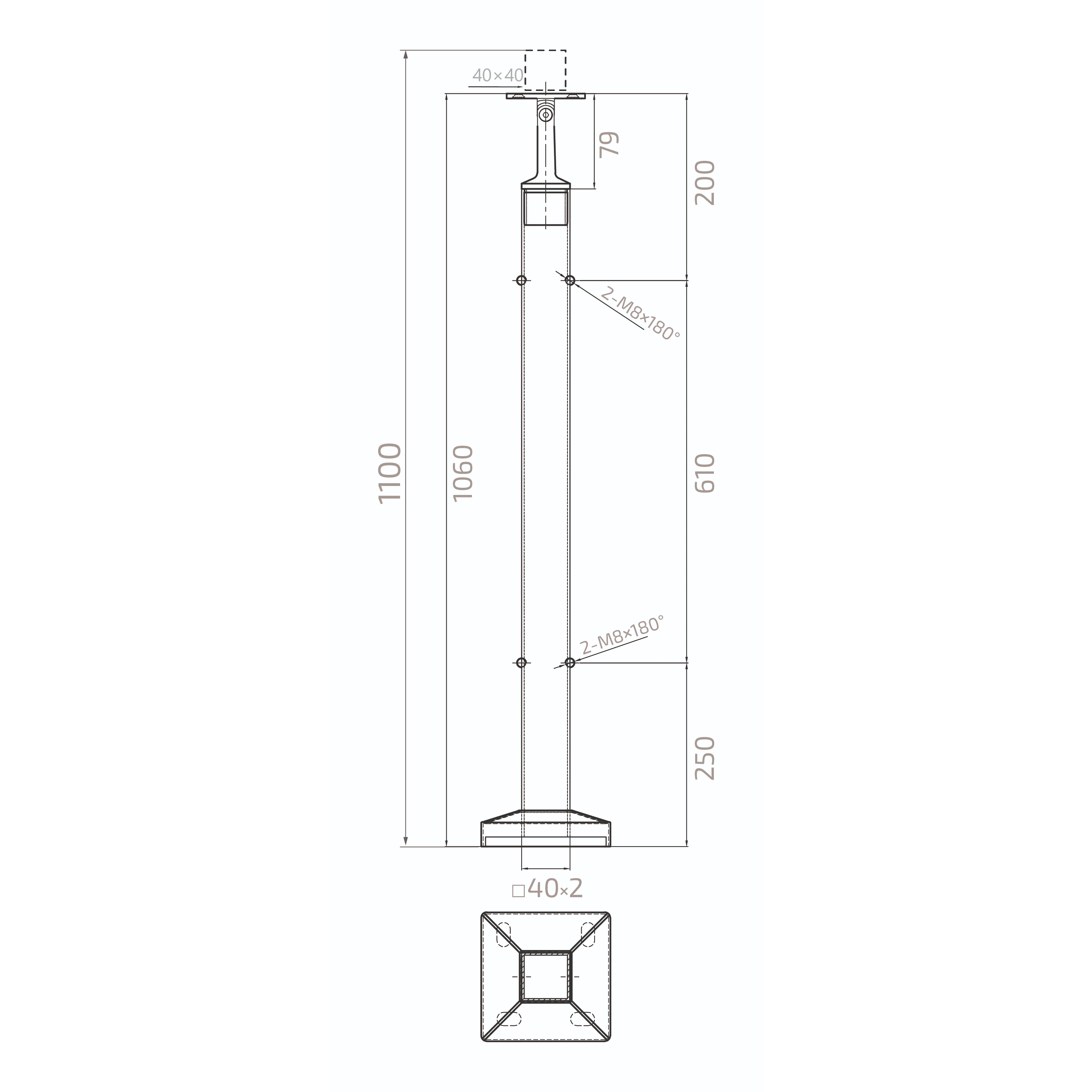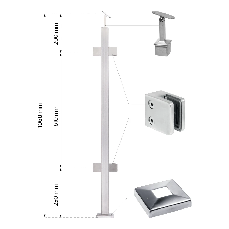 Mellemliggende gelænderstolpe i rustfrit stål AISI 304 med profil 40×40 mm og højde 1060 mm — komplet sæt med fire glasbeslag, håndlæderbeslag, afdækning og gummilister. Satineret finish giver et elegant, moderne udseende, som harmonerer perfekt med både altan- og trappegelændere. Solid konstruktion og præcis udførelse muliggør hurtig, professionel montering.