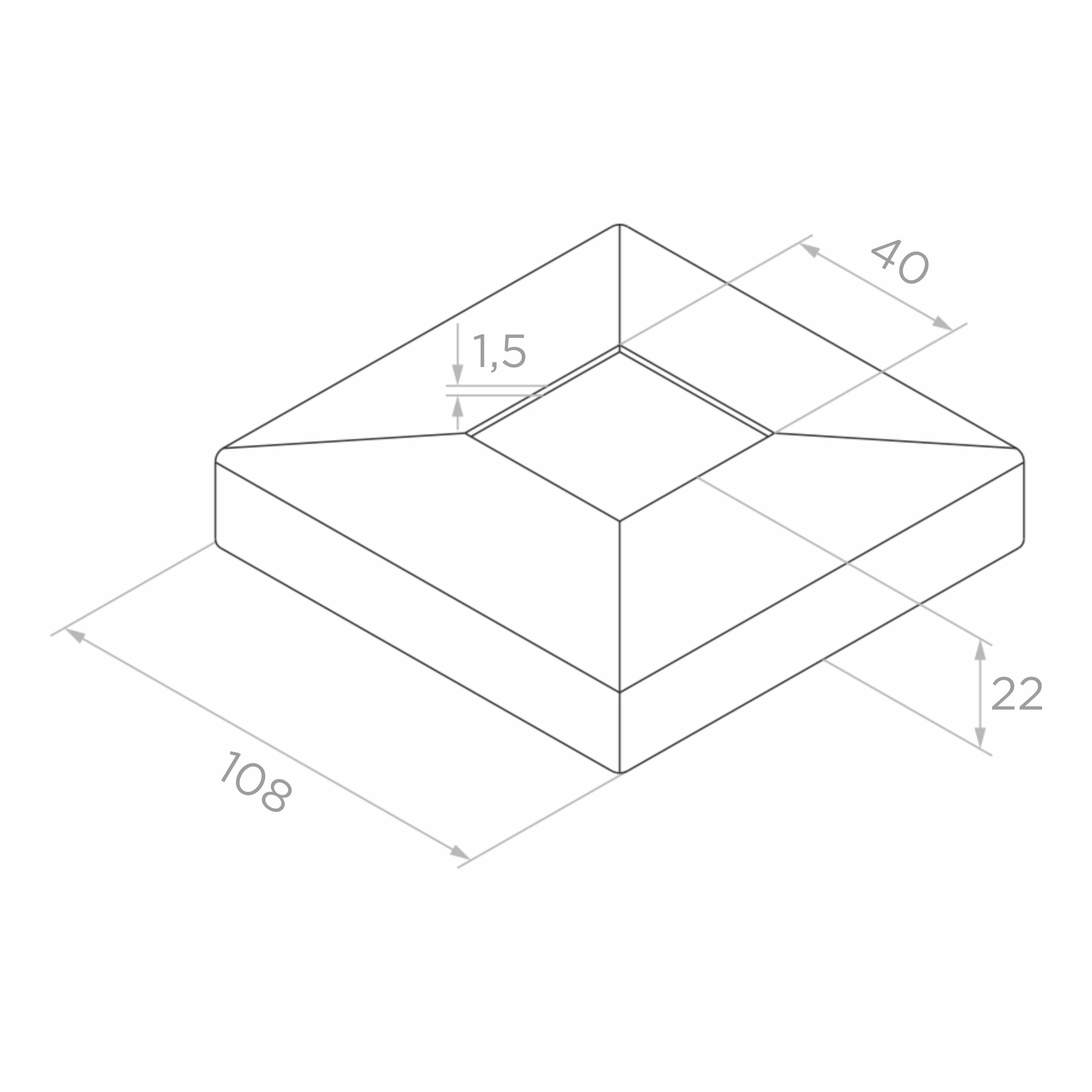 Sokkelafdækning med mål 108×108 mm og højde 22 mm (pladtykkelse 1,5 mm) dækker æstetisk monteringsstedet for stolpen i gulvet og sikrer en pæn afslutning.