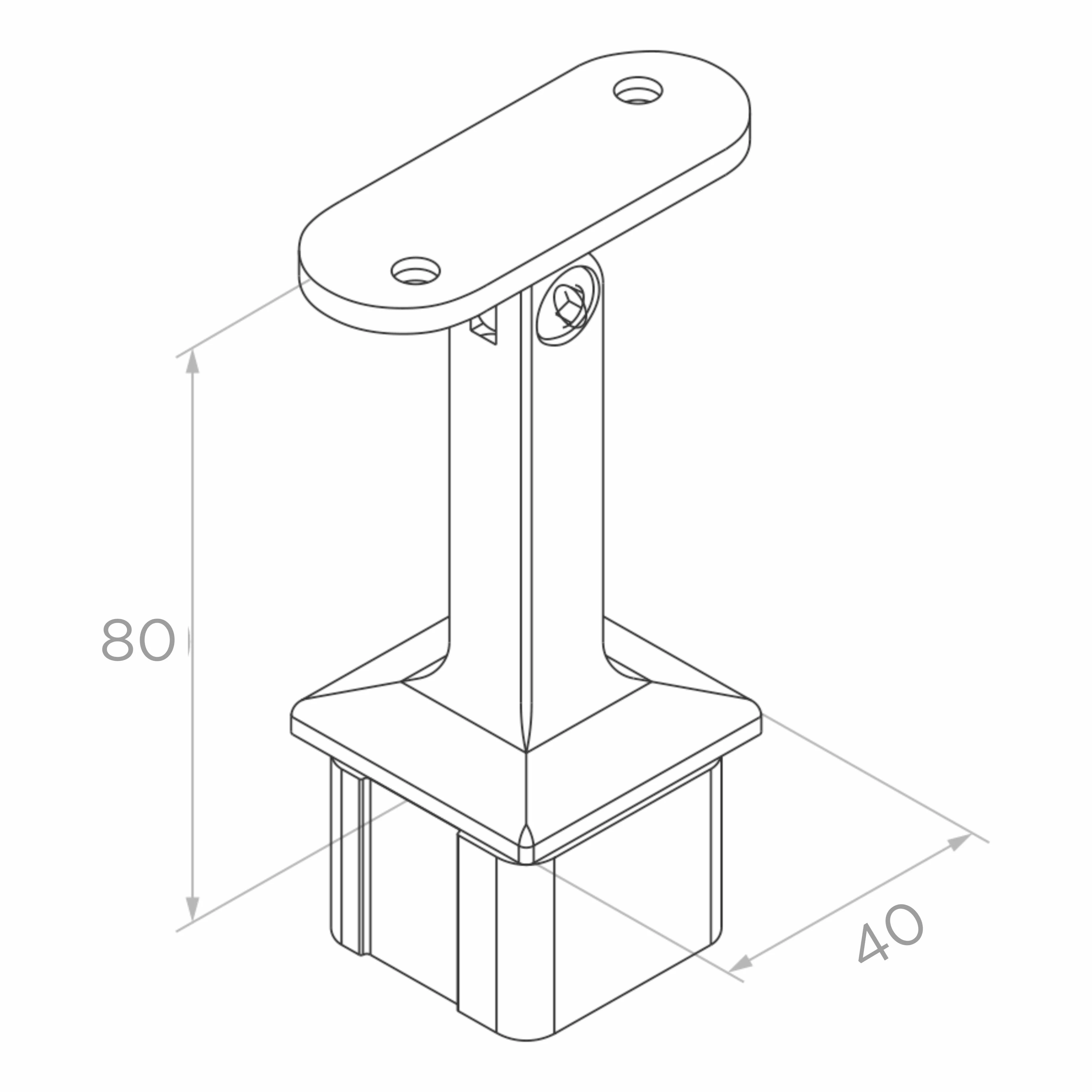 Håndlæderbeslag med højde 80 mm og base tilpasset til profil 40×40 mm — monteres fra toppen af stolpen med anaerobisk lim. Justerbar topplade muliggør præcis indstilling af håndlæderets hældningsvinkel.
