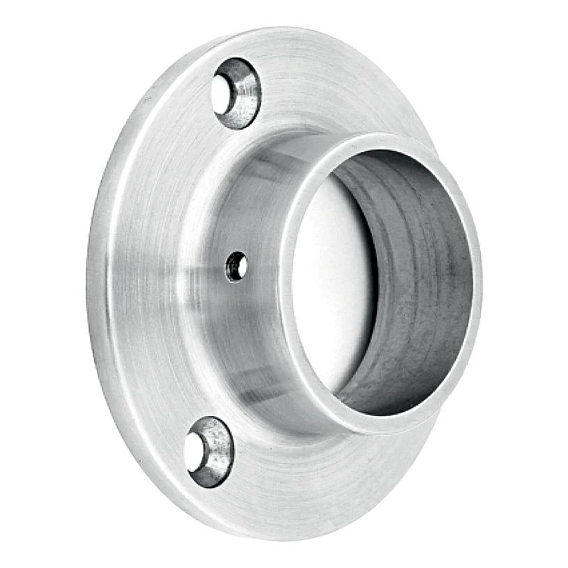 Flangen bruges til montering af gelænderhåndlister på væggen ved hjælp af M8 gevind. Den aksiale monteringsmetode sikrer en stabil og æstetisk forbindelse mellem røret og underlaget. Tre monteringshuller i flangen muliggør sikker tilskruning af elementet, og et sideværts hul til trykskrue giver mulighed for yderligere stabilisering af røret i fatningen.