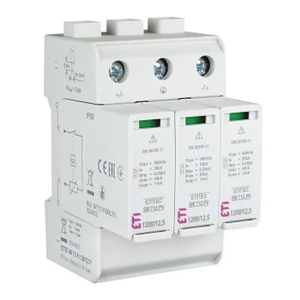 Overspenningsbeskytter PV DC Type 1+2 (B+C) 1200V 3P 12,5kA 4,4kV ETITEC SM T12 PV 1200/12,5 Y 002440630 ETI beskytter PV-moduler mod overspændinger både fra direkte lynnedslag og fra indirekte udladninger samt koblingsoperationer i nettet. Overspenningsbeskytteren er den ideelle løsning til objekter udstyret med eksternt lynafledersystem og beskytter systemet mod uforudsigelige overspændinger.