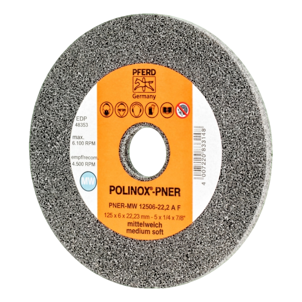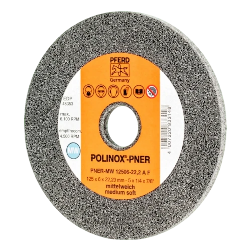 PFERD POLINOX®-PNER er en kompakt presset slibeskive af slibevlies, designet til præcis efterbehandling på vinkelslibere med variabel omdrejningshastighed. Takket være den medium bløde struktur (MW) og fine korundkorn (A F) er den fremragende til satinering, mattering, rensning og fjernelse af fine grater — også på rustfrit stål og varmefølige materialer.