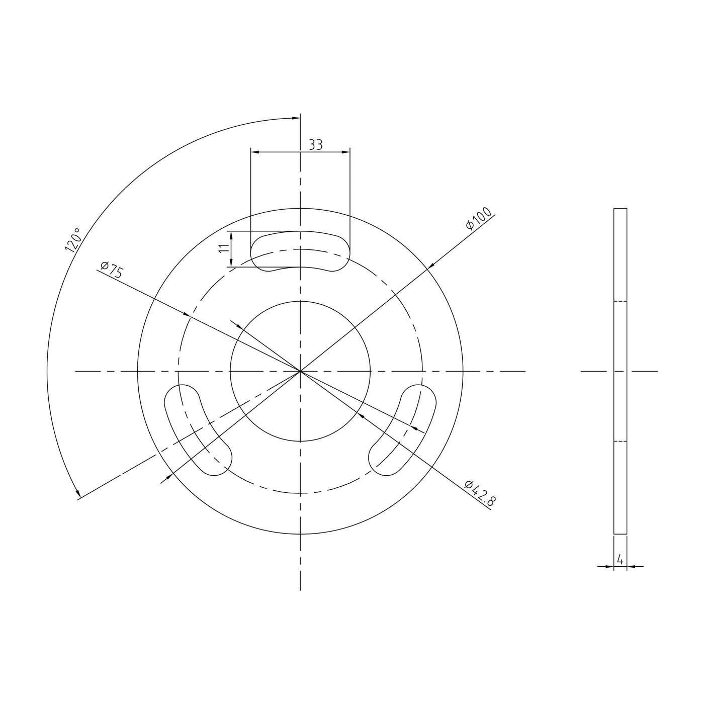 - Monteringshuller: 3 ovale huller placeret hver 120°