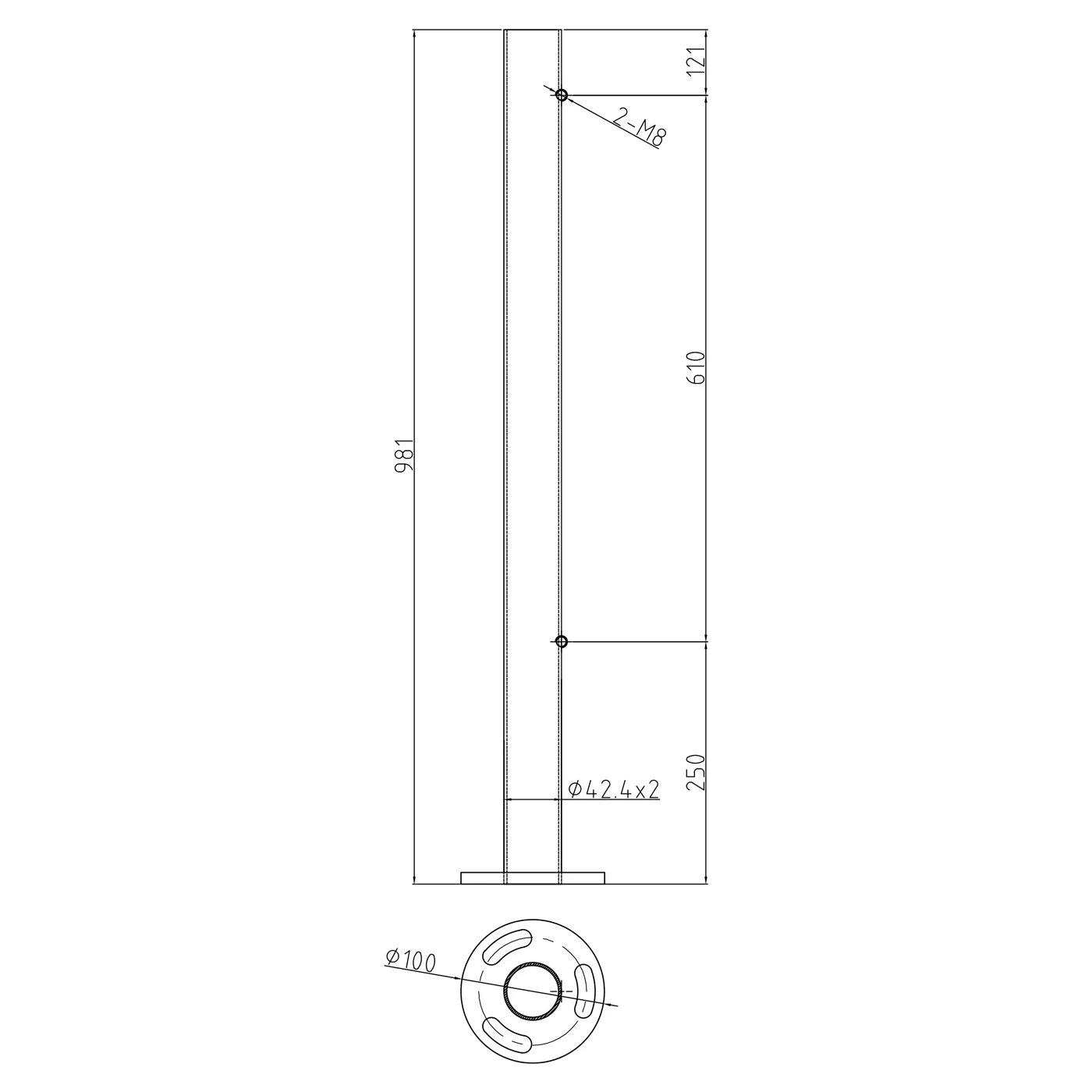 Stolpen har 2 huller med M8 gevind placeret på korpuset med en afstand på 610 mm. Det første hul er placeret 121 mm fra den øverste kant, det andet — 250 mm fra den nederste kant af stolpen. Dette arrangement muliggør let og hurtig fastgørelse af enhver holder til rør, stænger eller glas, hvilket giver installatøren fuld kontrol over gelænderkonfigurationen.