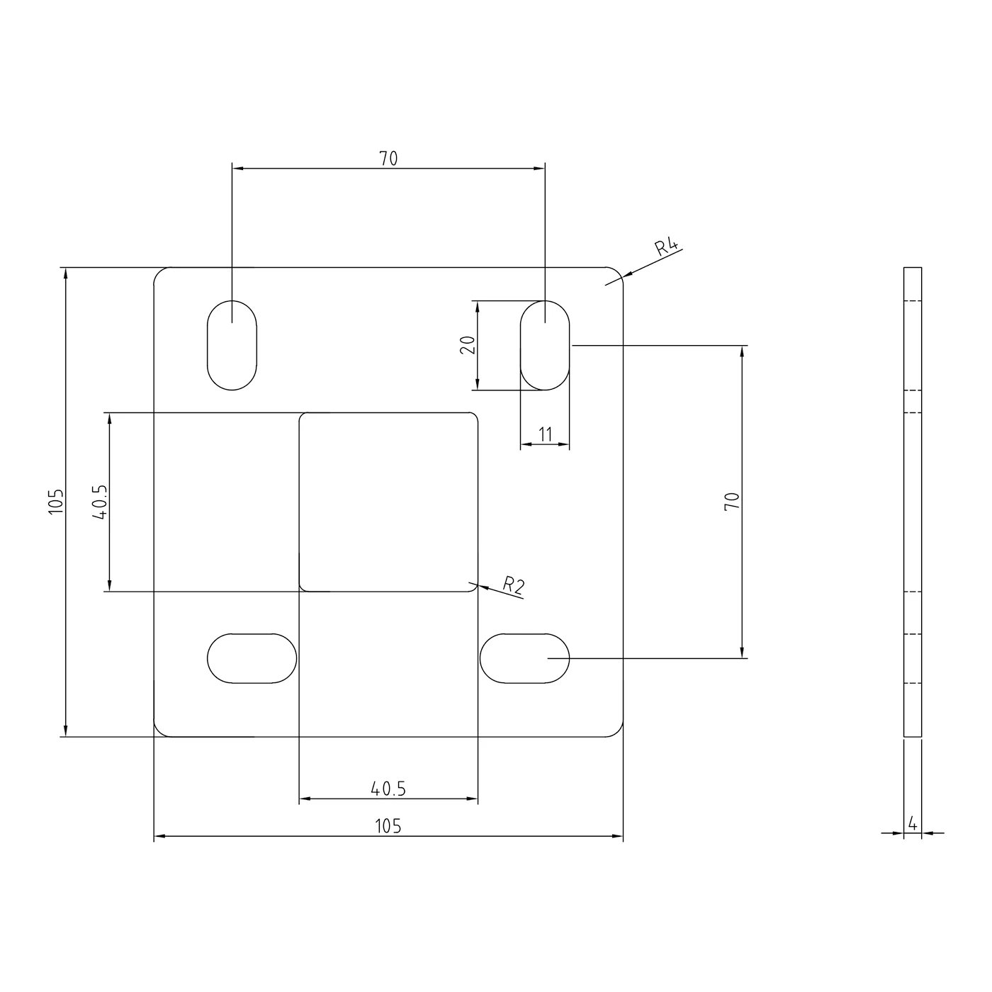 - Centralt hul (til søjle): 40,5×40,5 mm