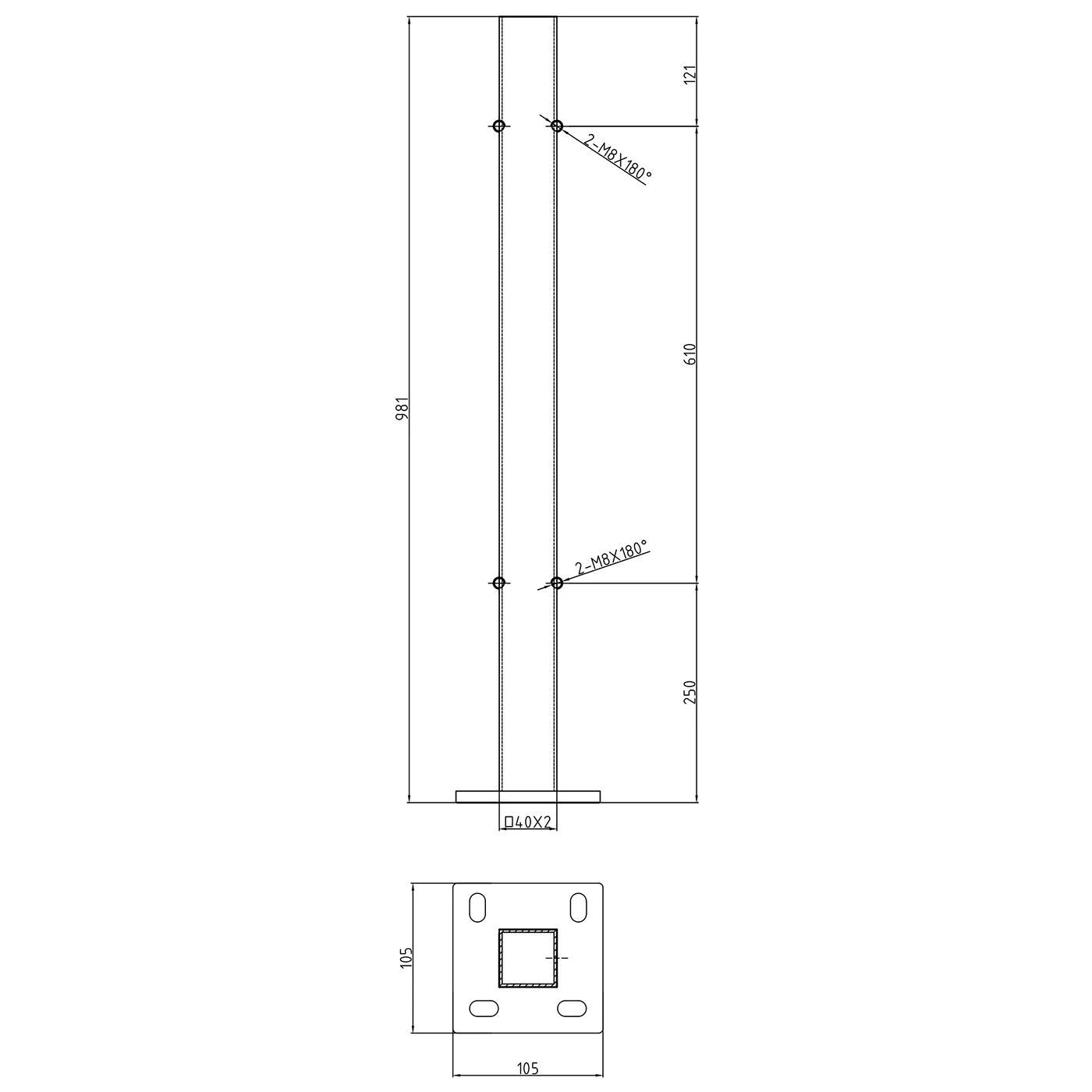 Søjlen er beregnet til fastgøring direkte i gulvet ved hjælp af påsvejset bundplade med dimensioner 105×105 mm. Fire ovale monteringshuller (aflange) i bunden tillader præcis justering af position under installation, hvilket markant fremskynder monteringsarbejdet og eliminerer fejl.