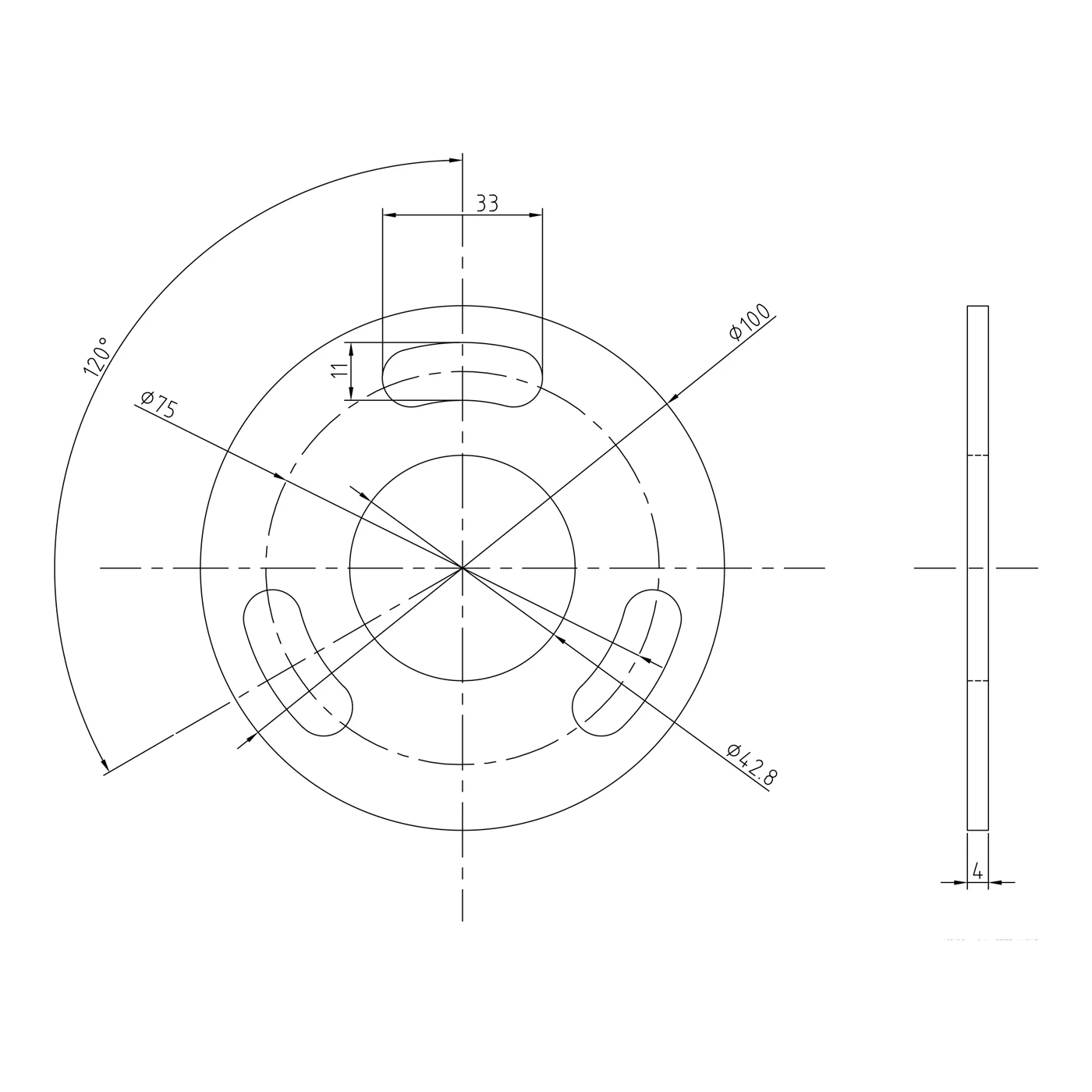 Den påsvejsede monteringsfod med diameter ø100 mm med tre aflange huller placeret hver 120° monteres direkte i gulvet. Denne monteringsmetode garanterer stabilitet og sikkerhed for konstruktionen selv på steder med stor trafiktæthed, såsom trapper i offentlige bygninger, hoteller eller kontorbygninger.