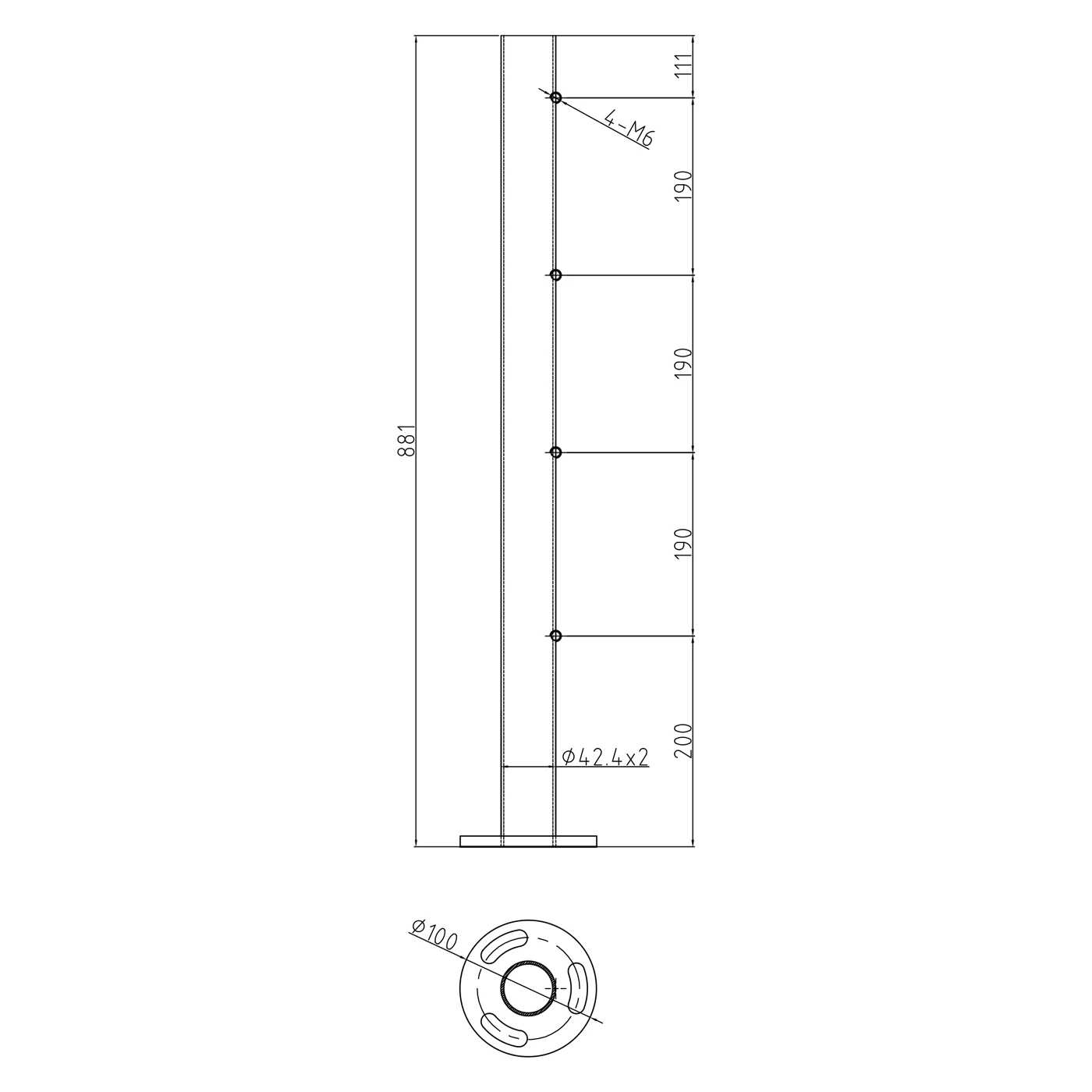 Mellemste gelænderstolpe PINOX i uudstyret version er et professionelt konstruktionselement designet til bygning af gelænder i rustfrit stål. Takket være 4 huller med gevind M6 placeret i lige afstande kan installatøren selv bestemme valget af beslag og udfyldninger — hvilket giver fuld fleksibilitet ved realisering af både typiske og utraditionelle projekter.