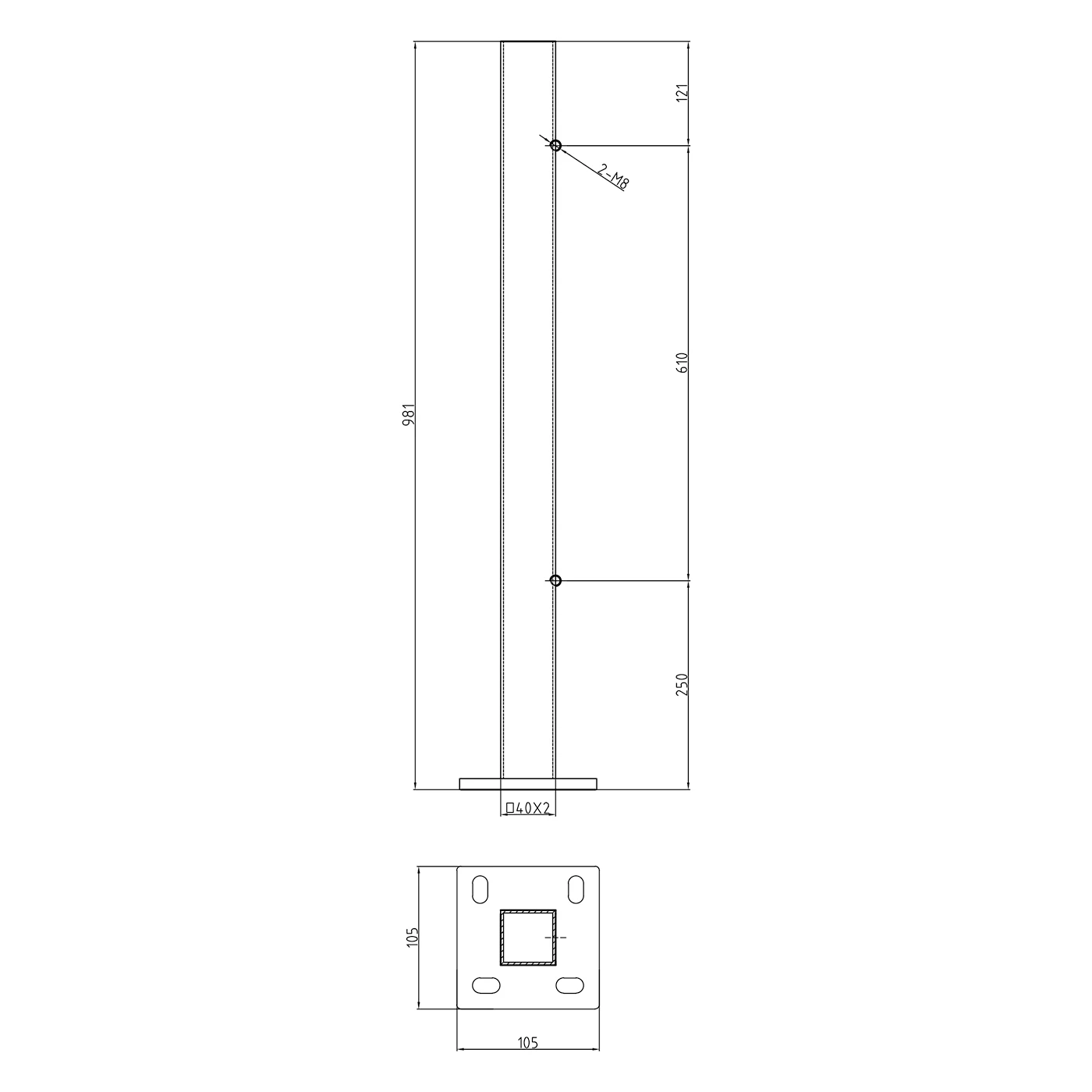 Stolpen monteres direkte til gulvet ved hjælp af påsvejst fod med dimensioner 105×105 mm med fire ovale huller. Den ovale form af hullerne (20×11 mm) muliggør justering af placeringen under monteringen. To huller med gevind M8 placeret på stolpen med afstand 610 mm tillader hurtig fastgørelse af gelændertværbjælker uden behov for boring eller gevindskæring på byggepladsen.