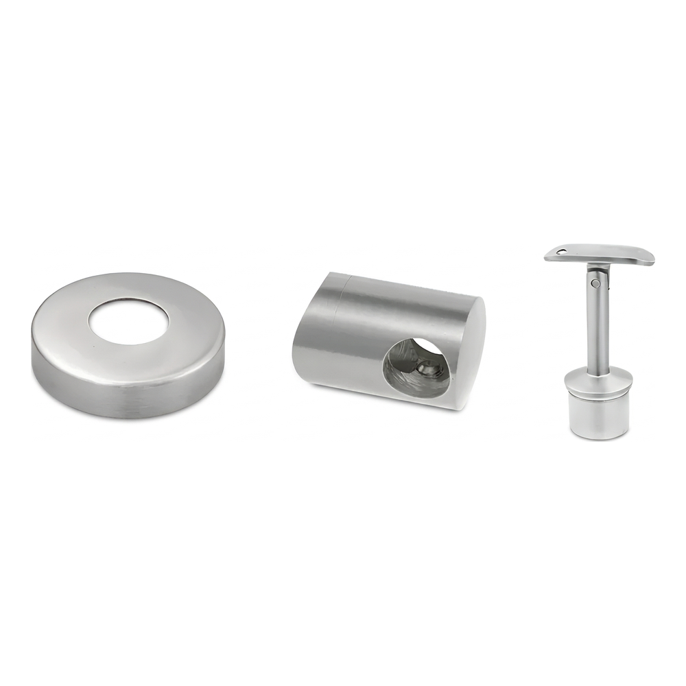 Hvert sæt indeholder monteringsklare komponenter: afskærmning til at dække søjlens gennemføring gennem gulvet, fire gennemgående beslag til udfyldningsrør samt justerbar håndlistetilslutning. Disse elementer muliggør hurtig og æstetisk færdiggørelse af gelænderet uden behov for at bestille tilbehør separat.