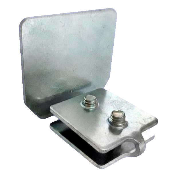 Afslutningens konstruktion består af frontplade (stopklods) og klemmemekanisme i U-form med to skruer, som sikkert omkranser skinnens nederste væg. Montering foregår ved at skyde elementet på skinnens ende og spænde skruerne — hurtigt, enkelt og uden svejsning.