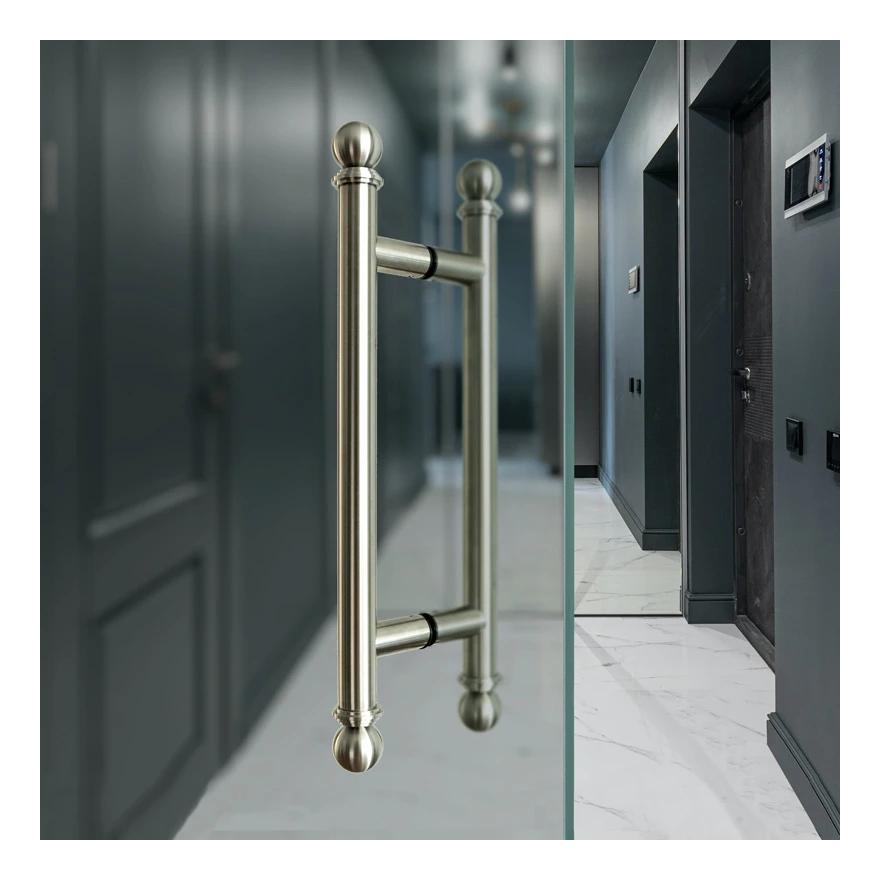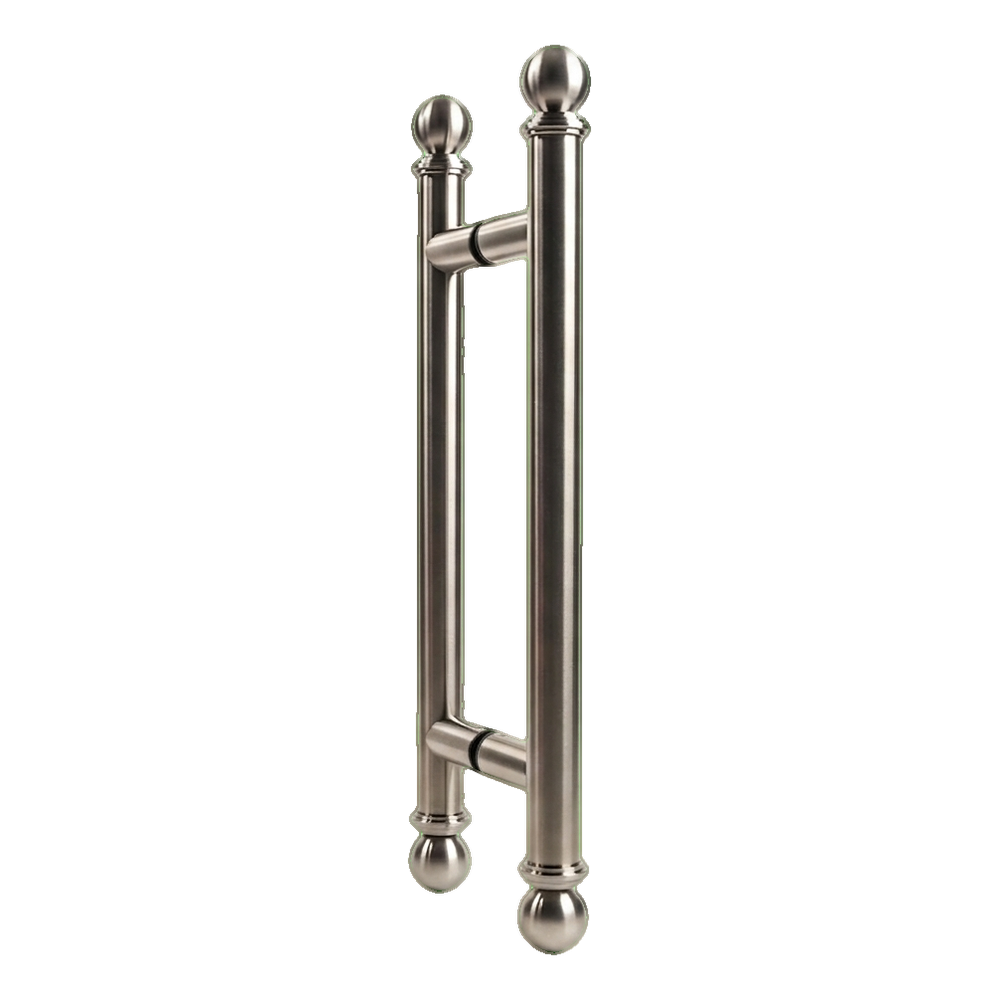 Dobbeltsidet greb PSG er et elegant dørgreb med klassisk design, fremstillet helt i højkvalitets rustfrit stål AISI 304 med satin finish. Dekorative afslutninger i form af kugler giver det en stilfuld, repræsentativ karakter — ideelt til kommercielle bygninger, kontorer, hoteller og eksklusive boligindretninger.