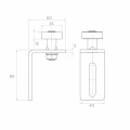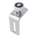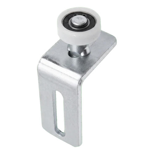 Førerrullen monteres på skydeportens stolpe ved hjælp af det medfølgende vinkeljern. Vinkeljernets lodrette arm (85 mm) fastgøres til stolpen, mens den vandrette arm (60 mm) stikker ud mod porten og holder rullen i linje med køreskinnen. Det langsgående monteringshul muliggør præcis justering af rullens højde og position, hvilket er særligt vigtigt ved nivellering af føringsskinnens C-profil.