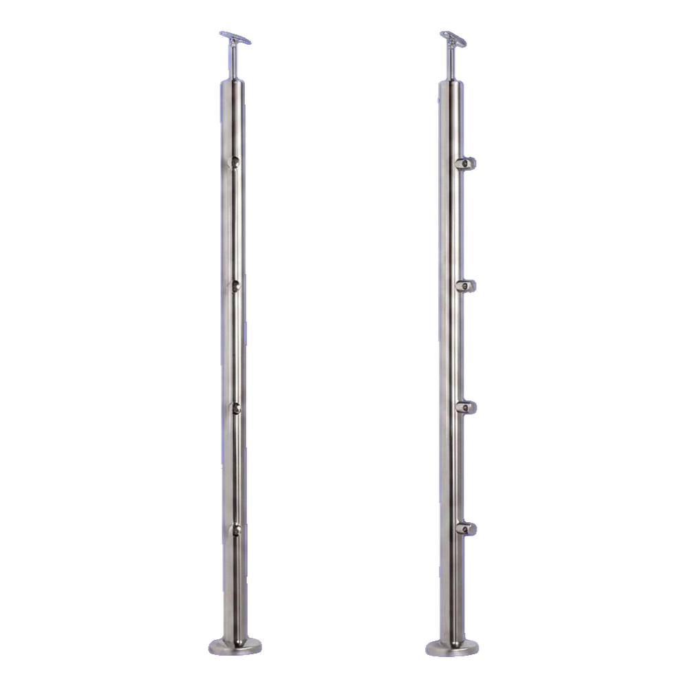 Mellemstolpe (gennemgående) til indvendige gelændere — balkon- og trappegelændere — fremstillet af højkvalitets rustfrit stål AISI 304 med satineret finish. Udstyret med 4 gennemgående holdere til fyldningsstænger Ø 12 mm, beregnet til gulvmontering. Den universelle konstruktion gør det muligt at anvende i forskellige arkitektoniske projekter, og de medfølgende tilbehør (bundskjuler, håndlædersamling) sikrer komplet og æstetisk montering.