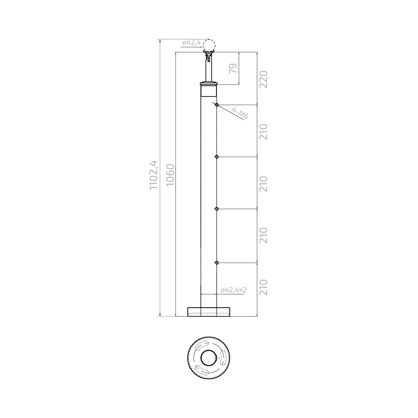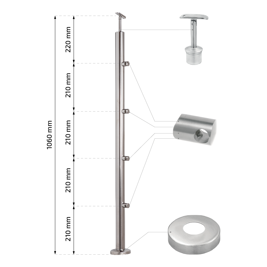 Stolpens totale højde med håndlædersamling er 1102,4 mm, hvilket i kombination med håndlæder Ø 42,4 mm giver en ergonomisk gelænderhøjde i overensstemmelse med byggekrav. Holderne er fordelt jævnt hver 210 mm, hvilket sikrer æstetisk opdeling af fyldet.