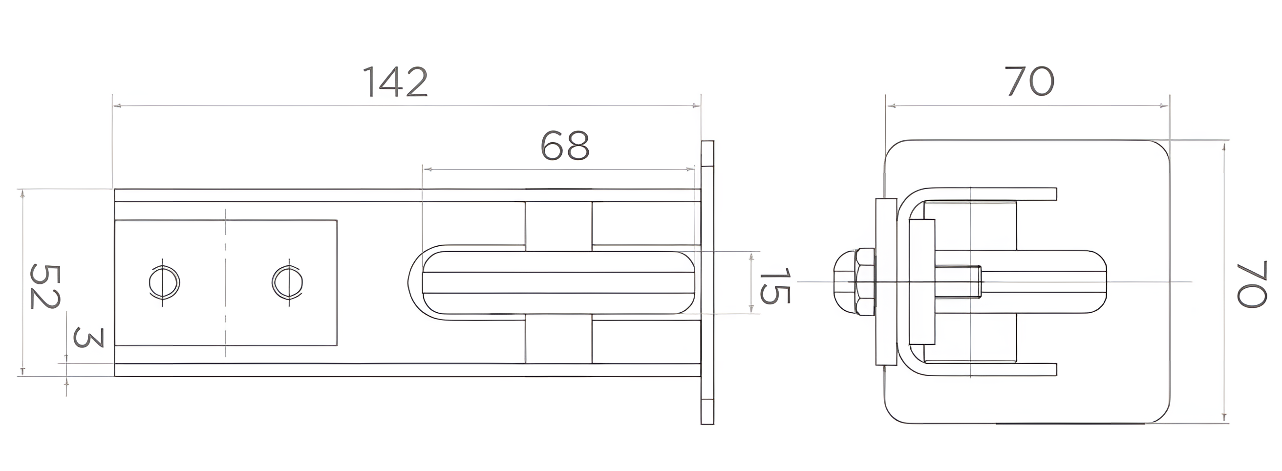 Kvadratisk afdækning 70 × 70 mm lukker æstetisk skinneprofilet, giver porten et pænt udseende og beskytter styreskinneindersiden. Den galvaniserede overflade sikrer høj korrosionsbestandighed, så elementet egner sig til installationer udsat for varierende vejrforhold — uden behov for yderligere korrosionsbeskyttelse.
